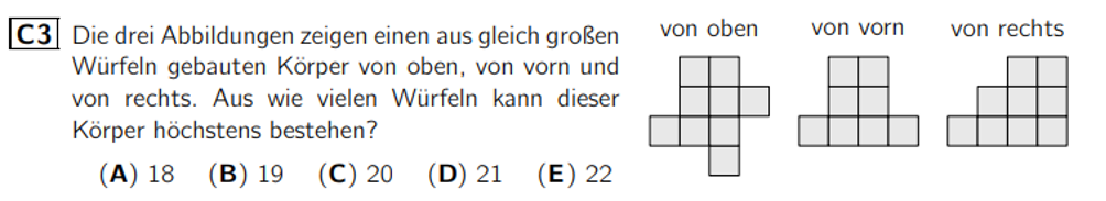 Dass dies maximal 18 Würfel sind, wussten immerhin 20 Schüler:innen. Die minimale Anzahl ist übrigen 15. Hättest du die Aufgabe auch lösen können?