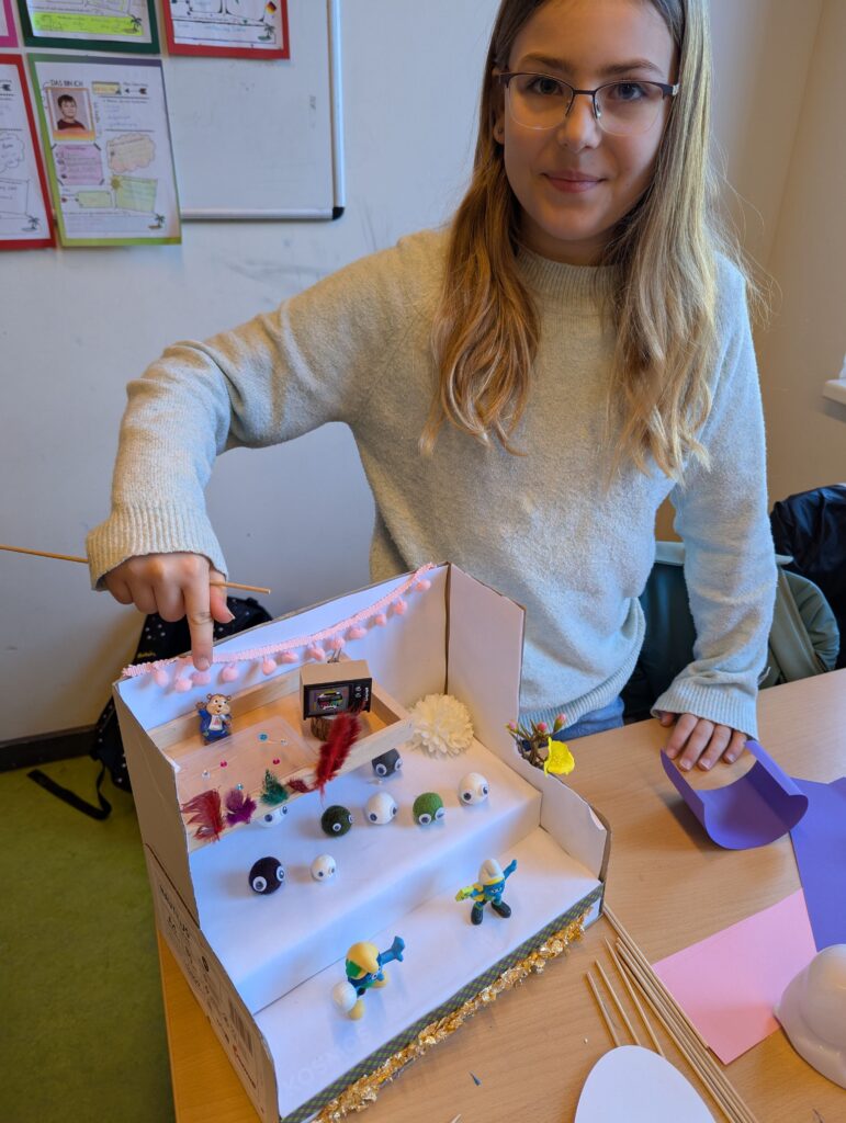 Besonderes Bastelgeschick bewies die Gruppe, die einen eigenen „Mathe-Kicker“ entworfen hat. Sobald der Ball ins Loch fällt, gibt das richtige Beantworten der Aufgaben Punkte. Das Publikum auf der Tribüne feuert an 😉