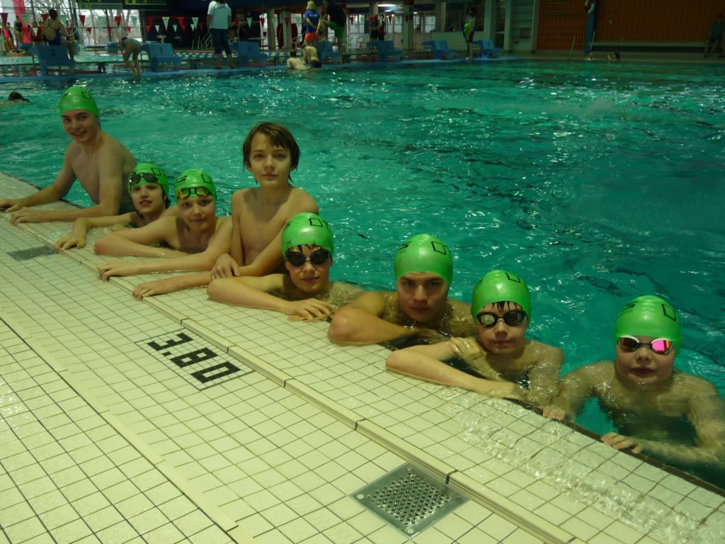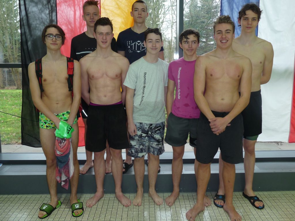 Die Jungen derselben Altersgruppen erzielten in ihrem Wettkampf einen guten dritten Platz. Sie verbesserten sich zum Vorjahr um zwei Plätze. Ein großes Lob auch deshalb, weil ein Fünf- und zwei Sechstklässler mit geschwommen sind! Wir sind gespannt auf das nächste Jahr! Gratulation an Maximilian S., Maximilian M., Karl, Roald, Claas, Jaron, Ole und Jonathan (und an den Ersatzschwimmer Philip)!