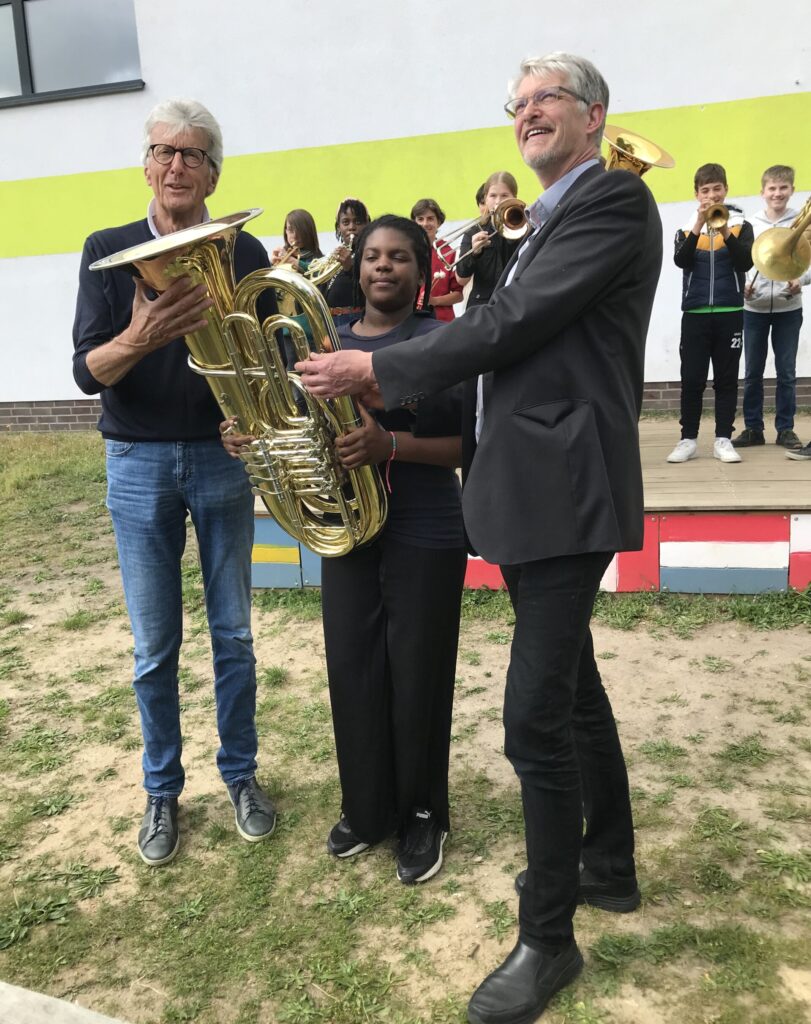 Eine Tuba nahm Favour aus den Händen von Michael Haukohl von der gleichnamigen Stiftung und Ole Nissen vom Kiwanis Club gestern Nachmittag in Empfang. Zusammen mit der Kulturmark, die durch Vorstandsmitglied Jutta Seuren vertreten war, hatten beide Stiftungen die Anschaffung des Instruments für unsere Blechbläser ermöglicht.