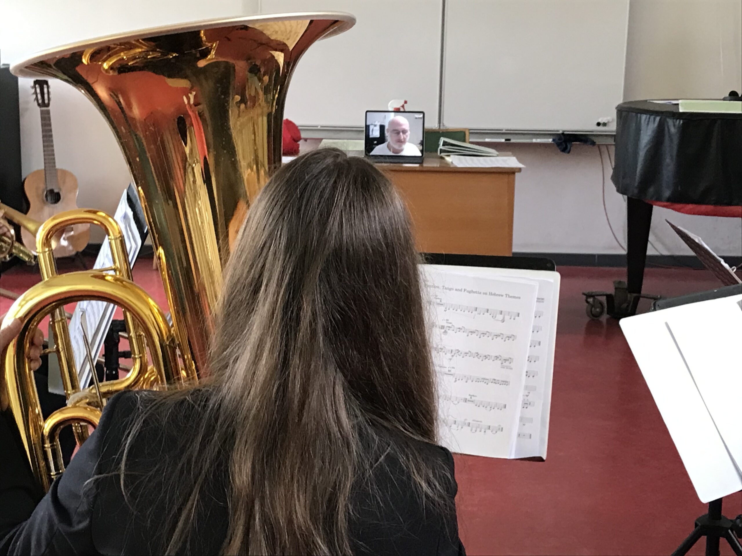 Den Höhepunkt des Besuchs bildete sicherlich die Probe des Zauberberg-Quintetts. Die Musiker wurden online unterrichtet vom Komponisten des Stücks Stanley Hoffman aus Boston. Mit seinem Werk werden Marius, Johannes, Benjamin, Helena und Natalie im Finale des Wettbewerbs „Jugend musiziert“ in der nächsten Woche teilnehmen. Fasziniert verfolgten die Förderer, wie Hoffman die Jugendlichen per Videokonferenz anleitete, und das auf Englisch!