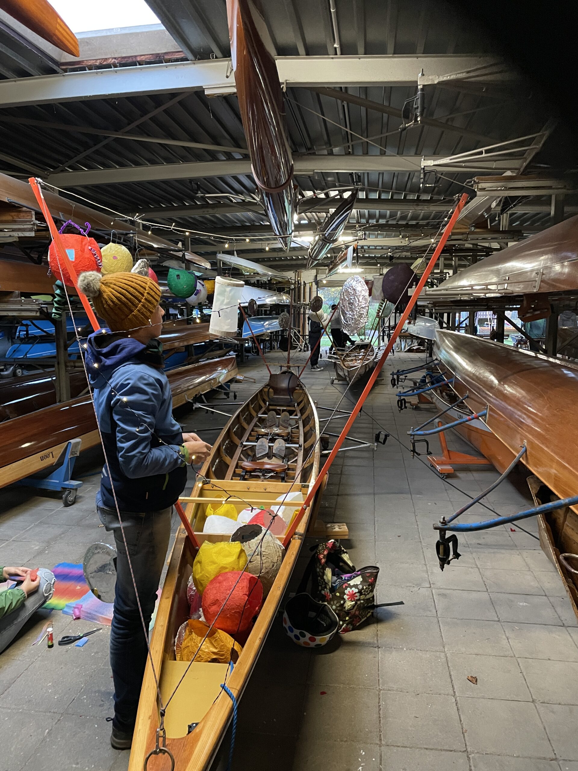 Die Lampionfahrt wird von den Protektorinnen der Ruder-Riege der Thomas-Mann-Schule organisiert. In diesem Jahr waren 8 Boote auf dem Wasser, 3 von der TMS, je 2 vom Burckhardt und dem Leibniz-Gymnasium in Bad Schwartau und eins vom Johanneum. Für die Mannschaften der TMS begannen die Vorarbeiten schon am Donnerstag. Sie mussten die Holzstangen befestigen und die Drähte spannen, an denen die Lampions befestigt werden sollten, die die Jugendlichen in den Herbstferien und in der letzten Woche selbst gebastelt hatten. Die Batterien für das weiße Rundumlicht mussten aufgeladen werden und am Ende wurden noch die Laternen verteilt, die ihre Vorgänger gebastelt hatten.