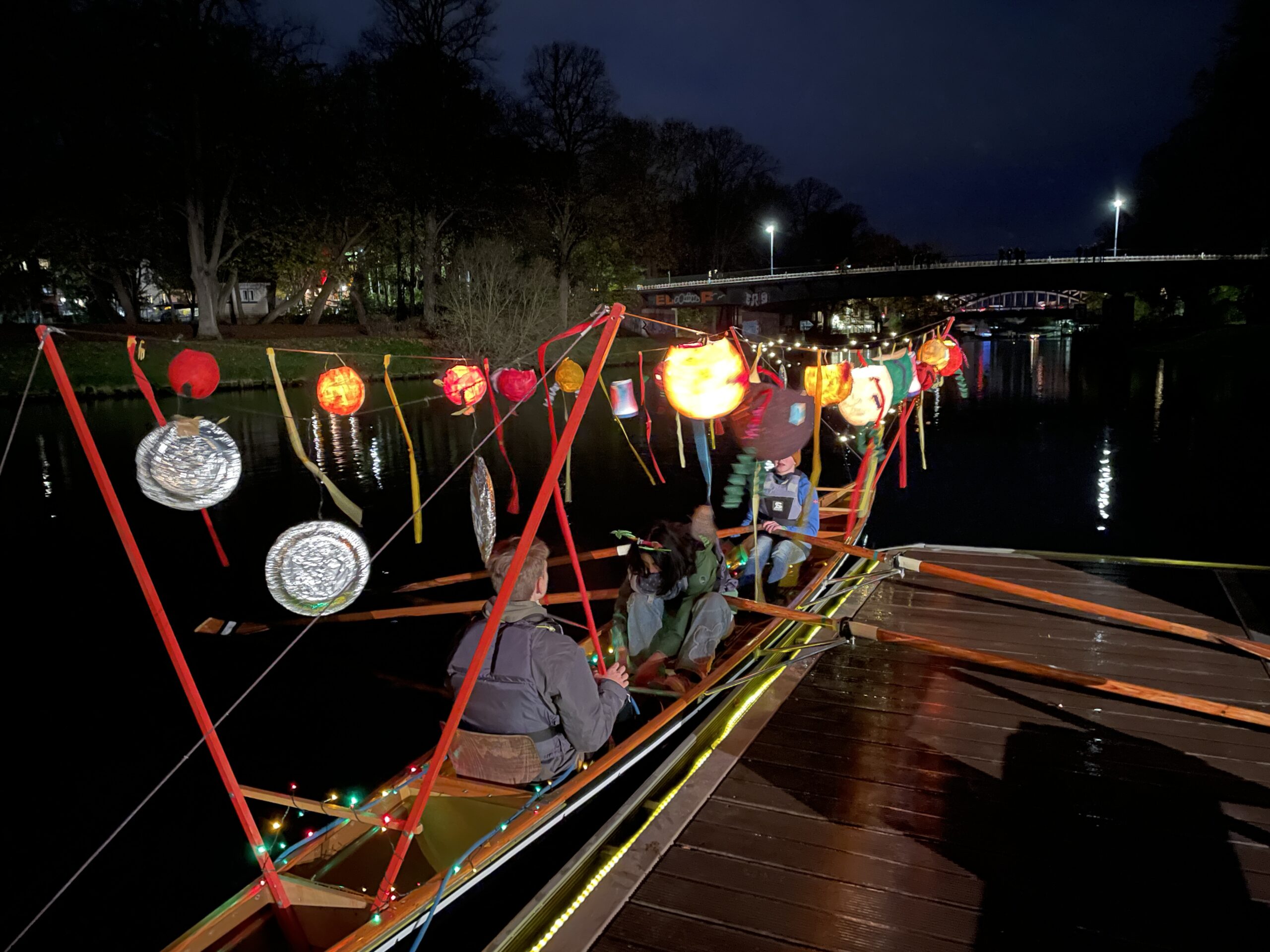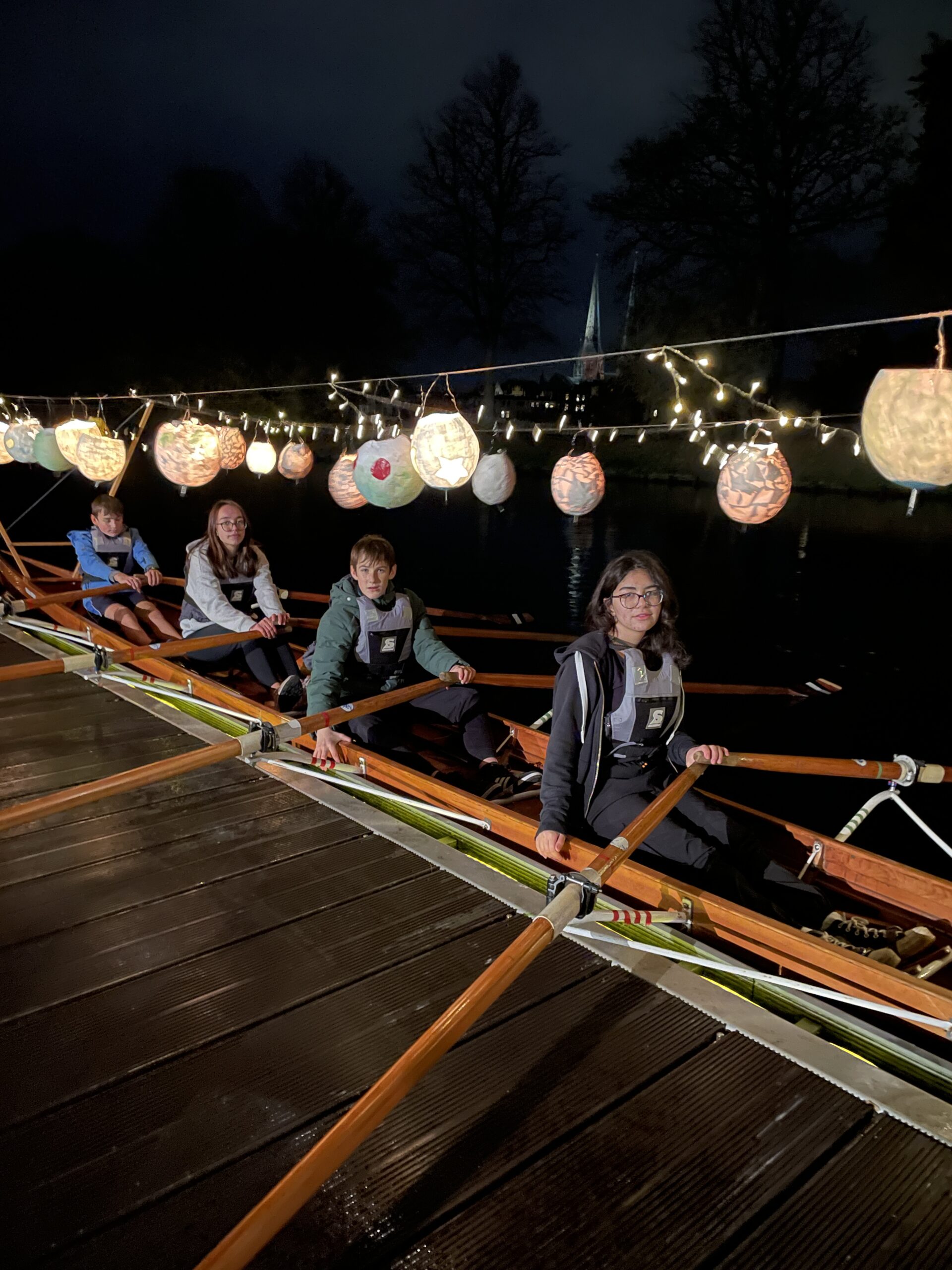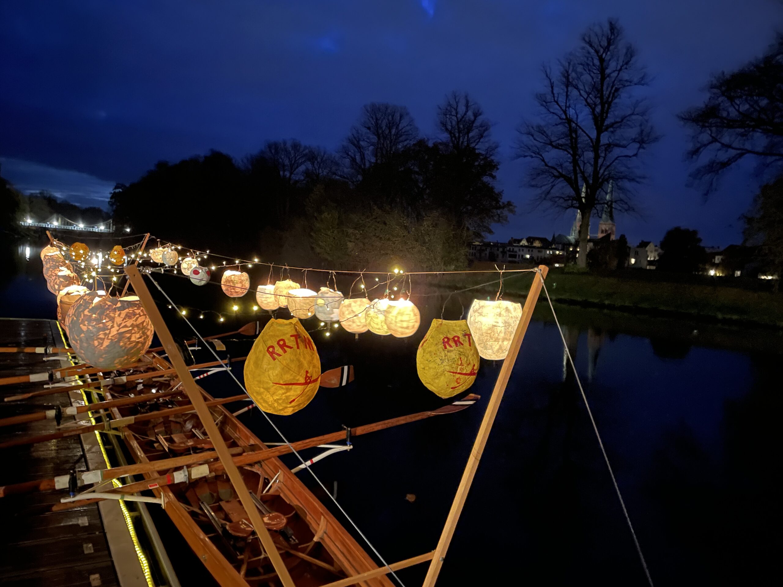 Ziel ist es, die Boote so hell wie möglich erstrahlen zu lassen. Deshalb hatten Heidi, Charlotte, Ela, Teja und Linus nur weiße Lampions aufgehängt, vorn und hinten je 2 gelbe Laternen mit den Buchstaben RR TMS, und zogen ein Floß mit bunten Laternen hinter sich her.