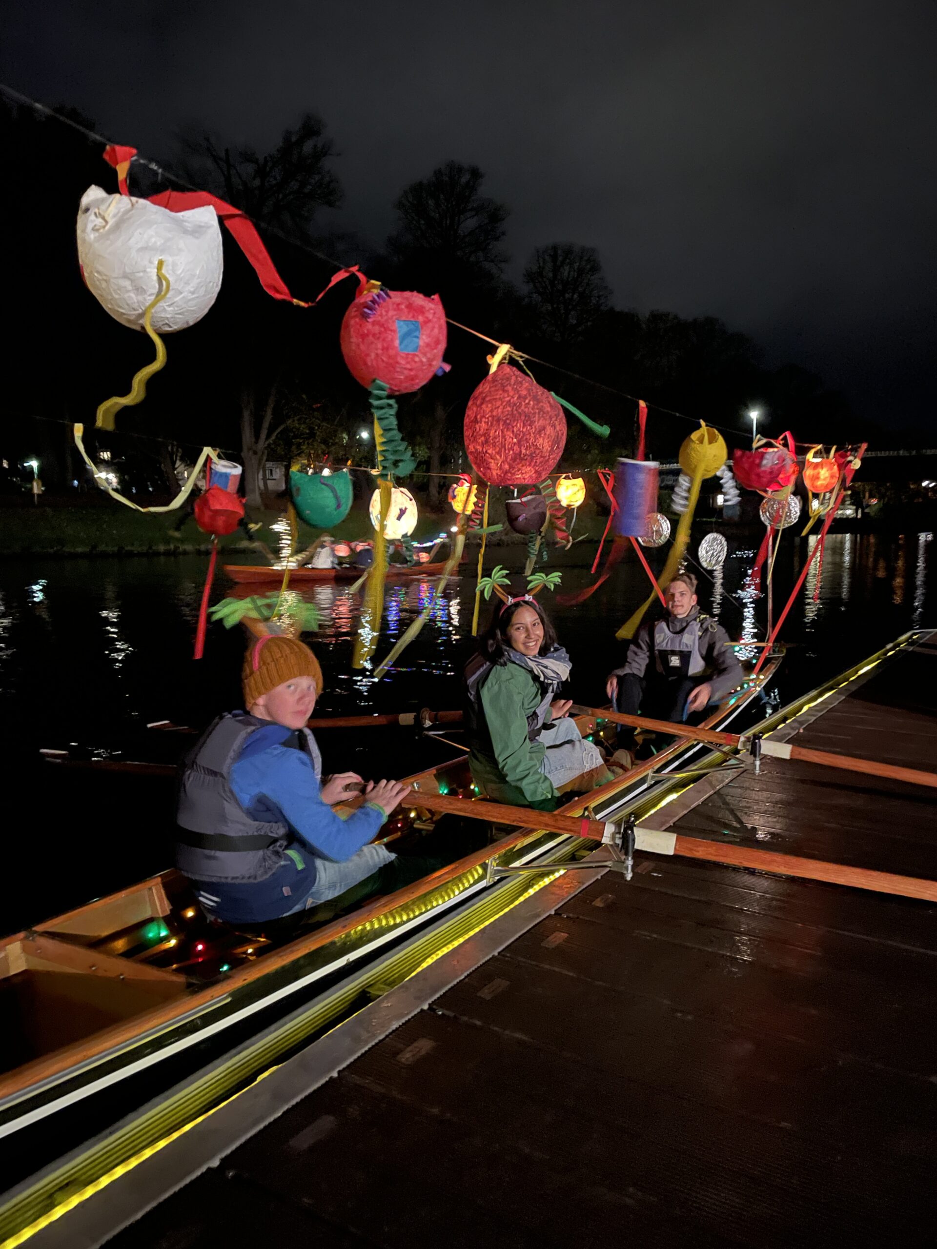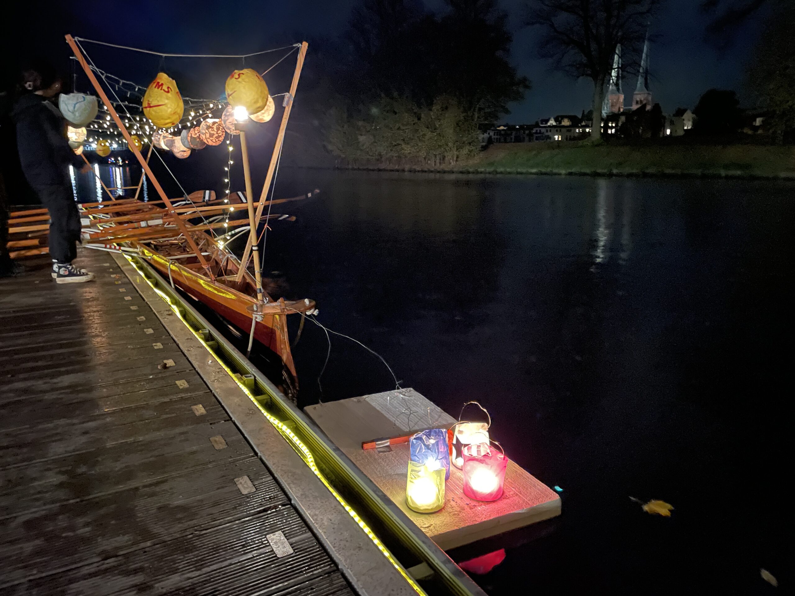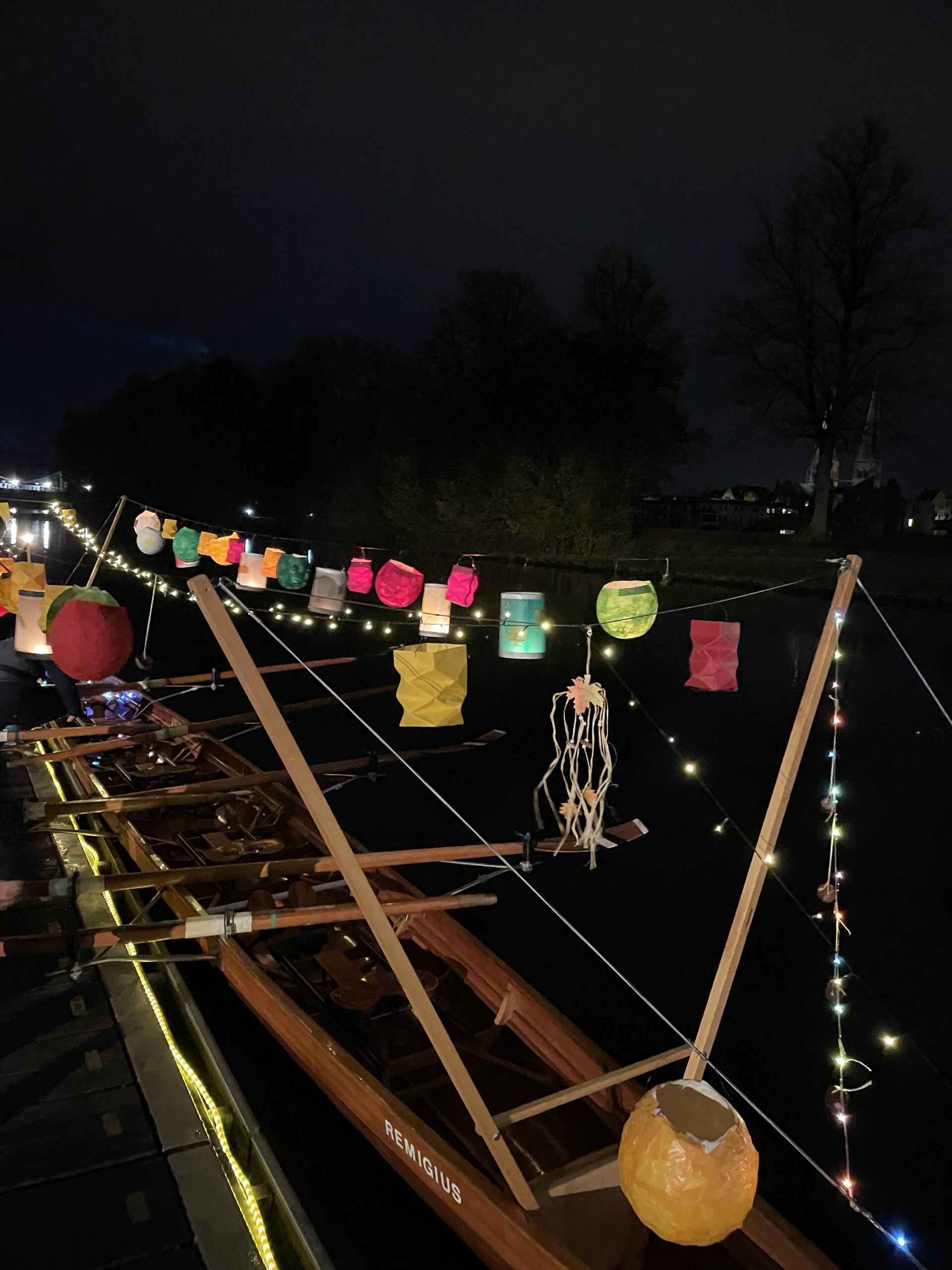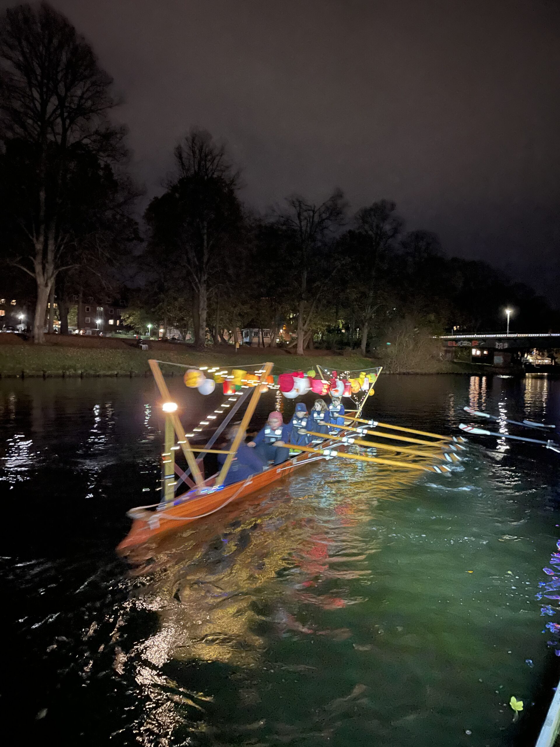 Ziel ist es, die Boote so hell wie möglich erstrahlen zu lassen. Deshalb hatten Heidi, Charlotte, Ela, Teja und Linus nur weiße Lampions aufgehängt, vorn und hinten je 2 gelbe Laternen mit den Buchstaben RR TMS, und zogen ein Floß mit bunten Laternen hinter sich her.