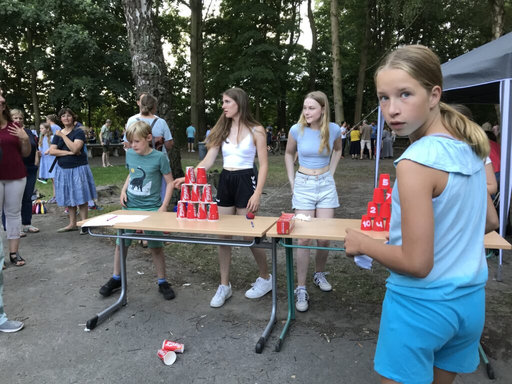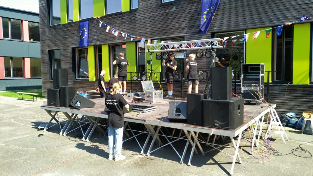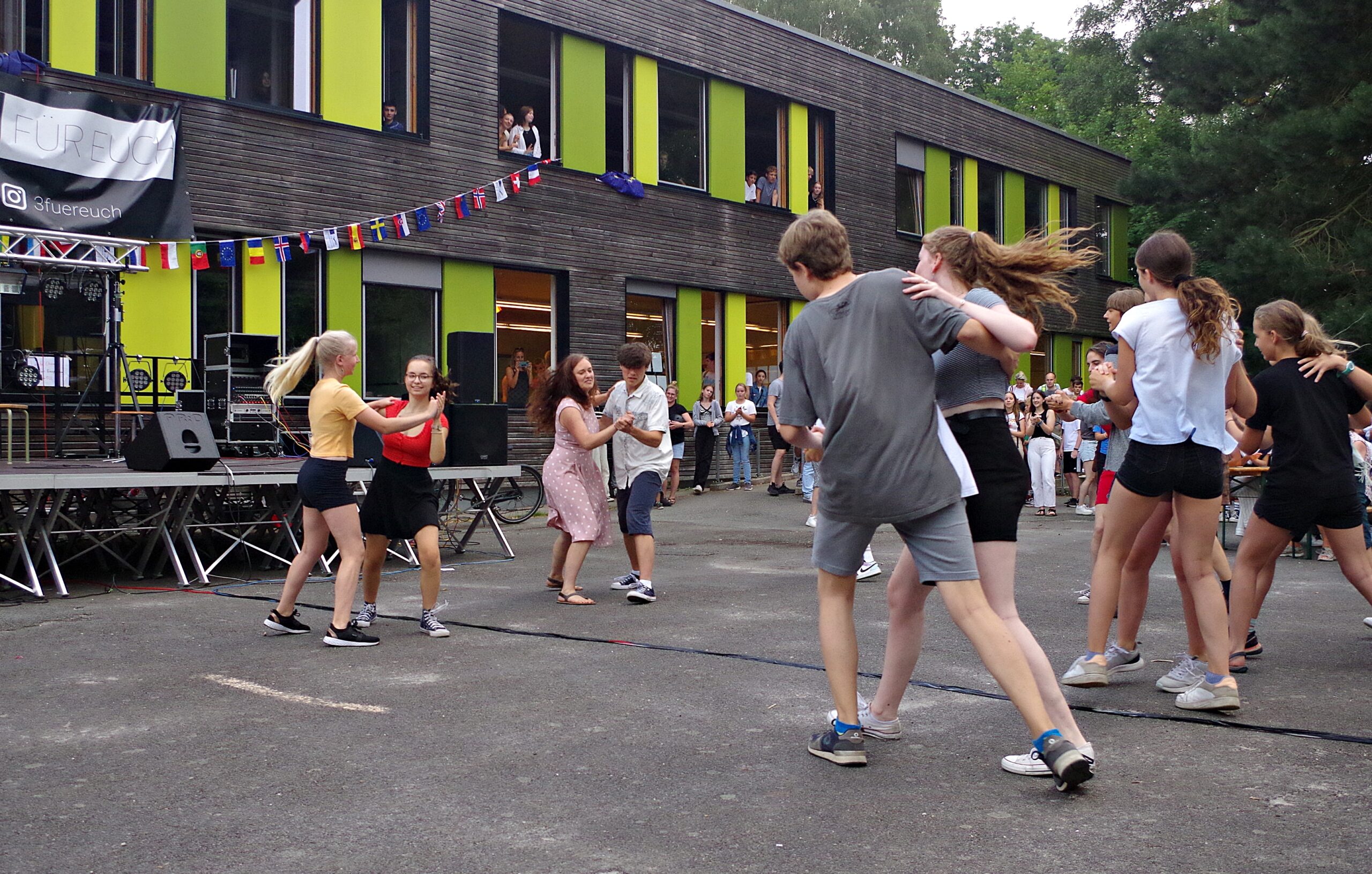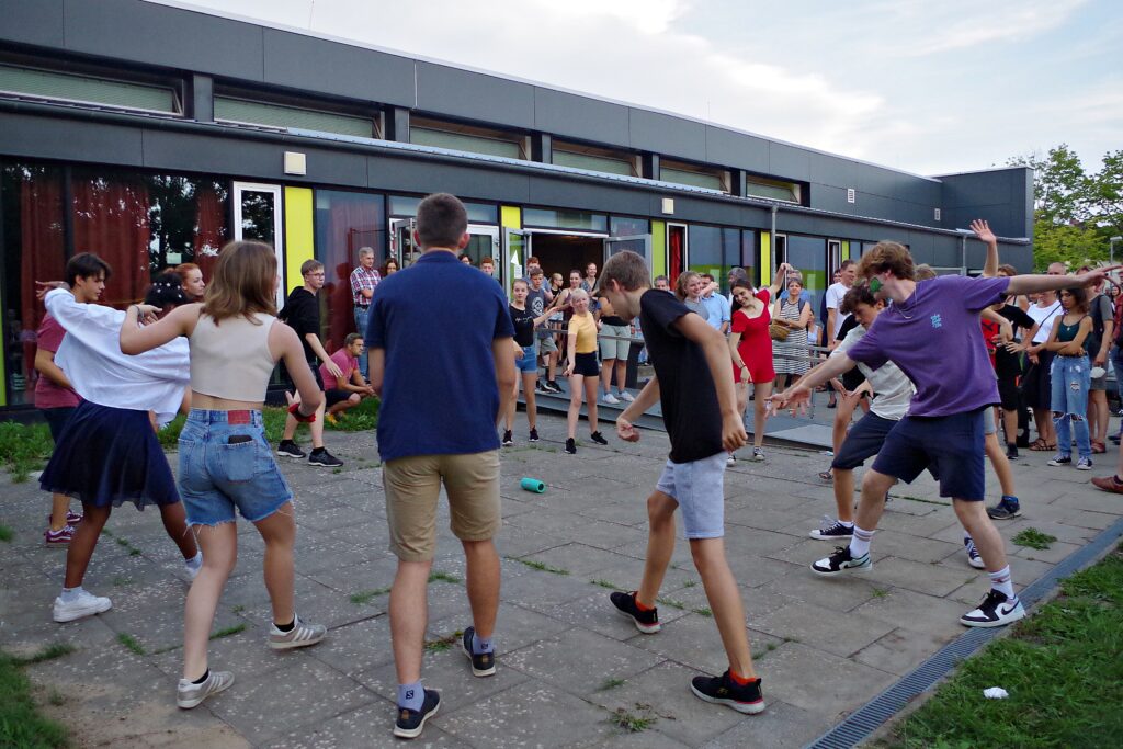 Ab 18:00 Uhr stießen dann viele ehemalige Schüler:innen und Lehrkräfte dazu und feierten zusammen mit Oberstufenschülern und Eltern in die sommerlich warme Nacht hinein. Unterstützung erhielt unsere Schule durch die Technik-Crew der OzD, die ihre Musikanlage und die Bühne zur Verfügung stellte, aufbaute und betreute.