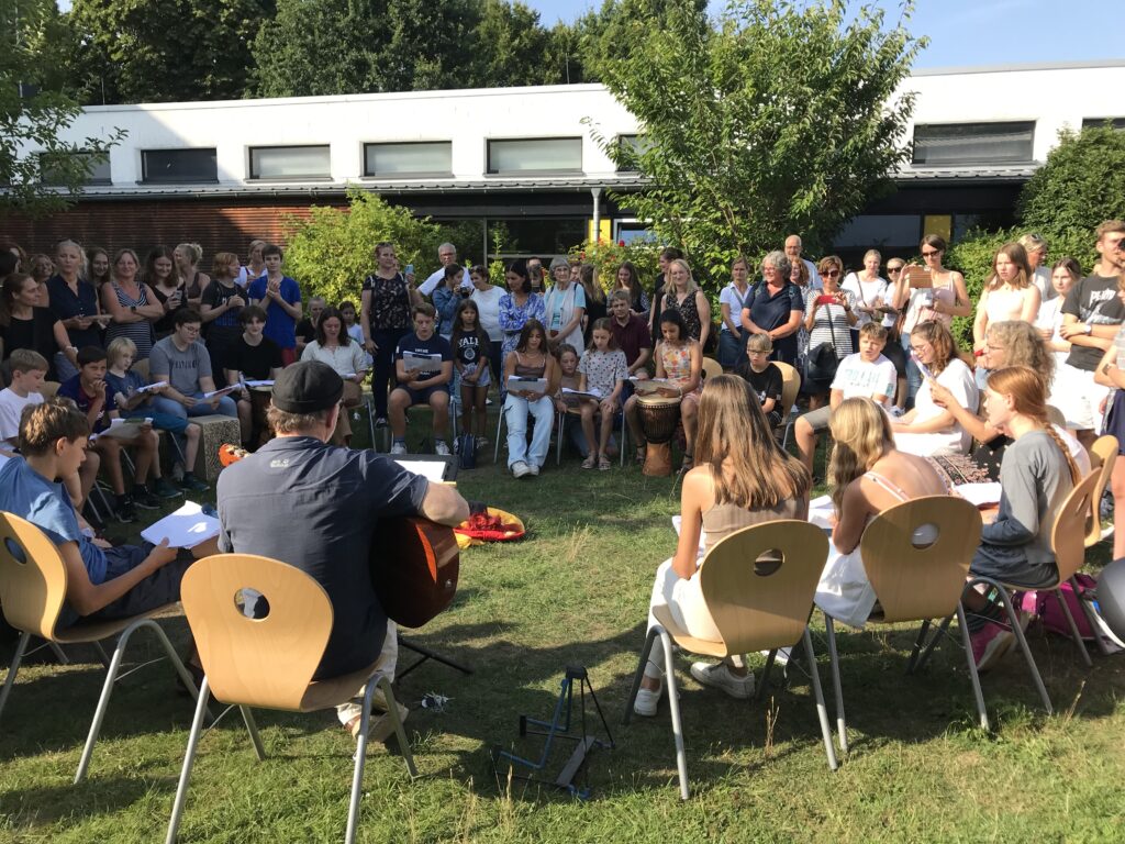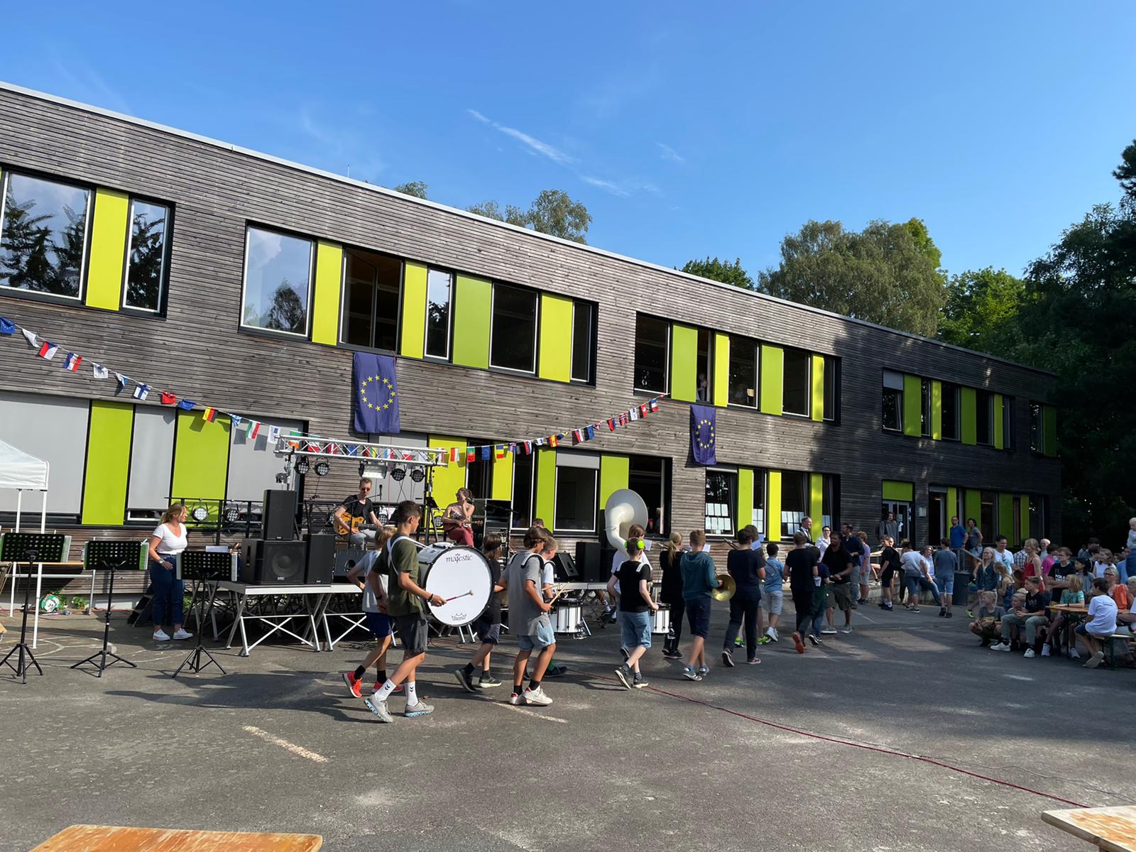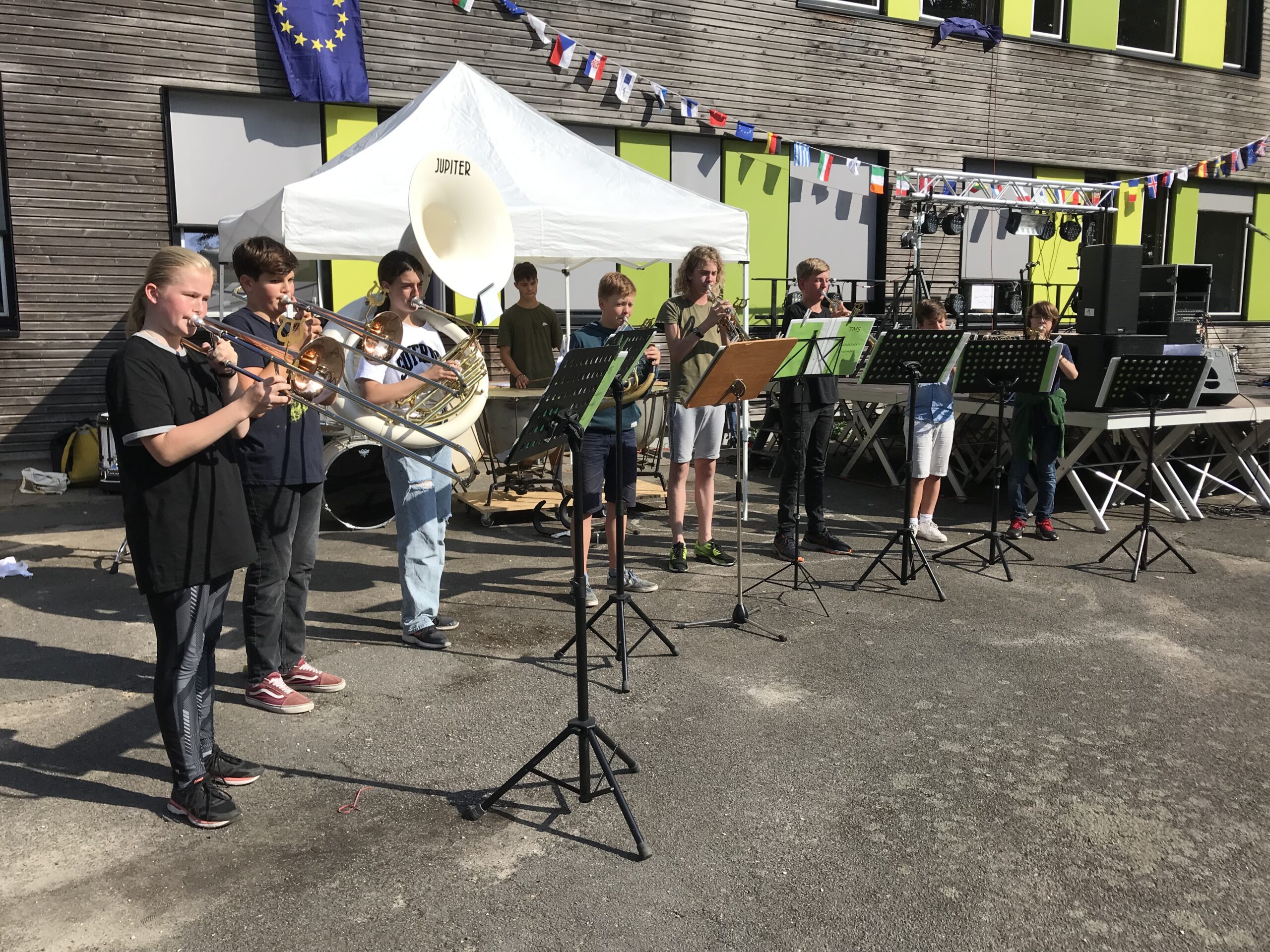 Unser Blechbläserensemble hatte in der letzten Ferienwoche ein Probencamp in der Schule durchlaufen und Schlagzeuger dazugenommen, sodass die Musiker jetzt gemeinsam als Marching Band um den Schulhof zogen.