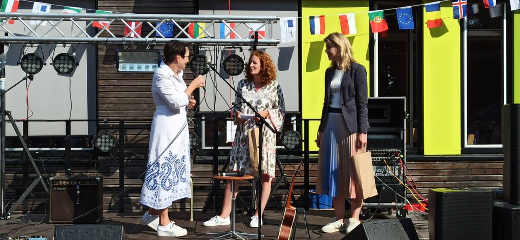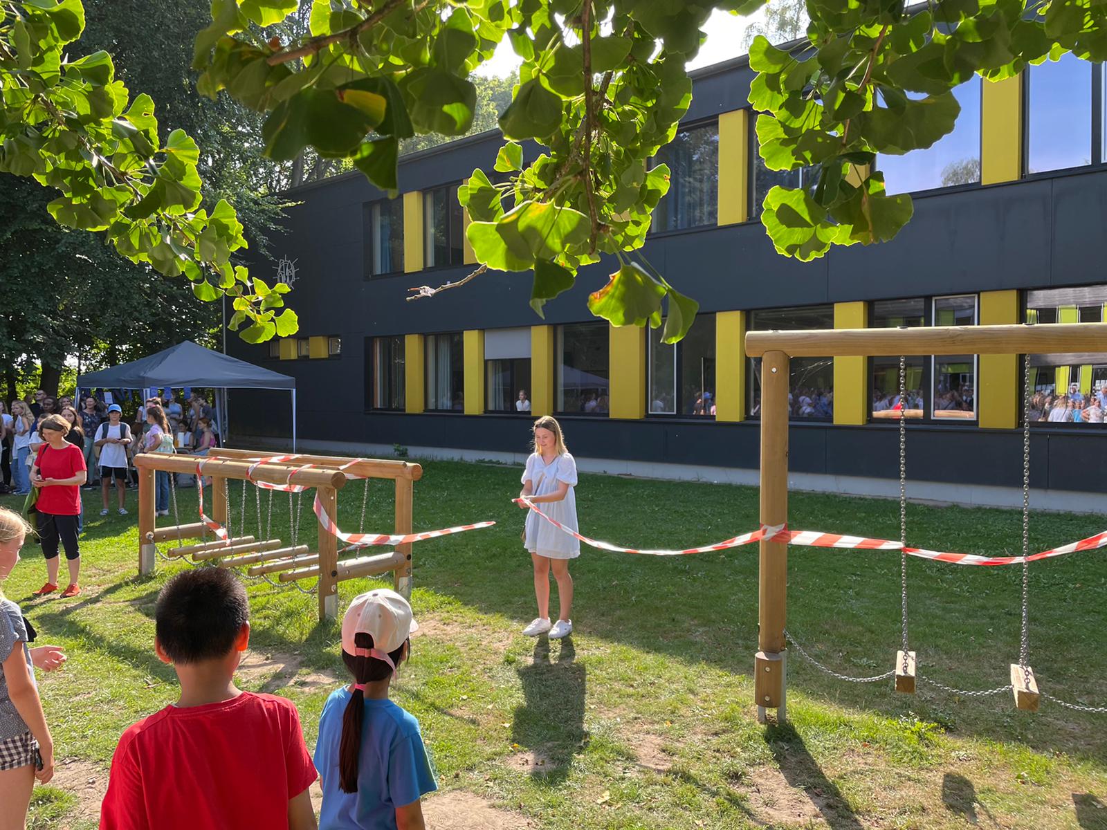 Der Nachmittag des 26.8. begann zunächst mit der Einweihung der neuen Spielgeräte auf dem Europahof. Rieke und Michel aus dem diesjährigen Abijahrgang übernahmen den Countdown und das Durchschneiden des Bandes. Ihr Wipo-Kurs hatte das Schulhofprojekt initiiert.