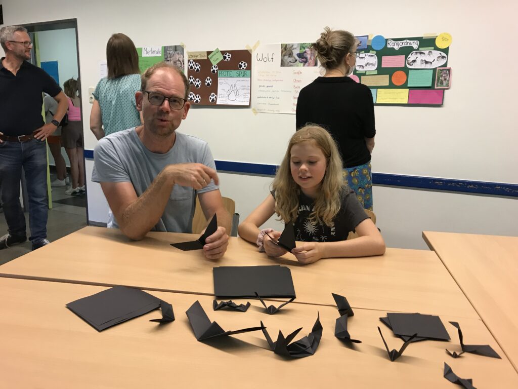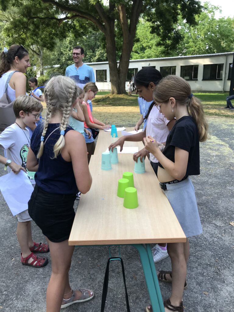 Nach der Eröffnung schwärmten die Besucher aus und besuchten die Ergebnispräsentationen der Projektgruppen. Tolle interaktive Angebote, wie Tänze, gemeinsames Singen, Basteln, ein Escape Room und vieles mehr animierten die Besucher zum Mitmachen. Begeistert waren gerade die jüngeren Besucher auch von der Miniolympiade, die sich die Fünftklässler mit ihren Klassenlehrkräften und Paten ausgedacht hatten: Disziplinen, wie Drei-Bein-Laufen, Dosenwerfen oder blind ein Labyrinth zu durchqueren, erforderten Geschicklichkeit.