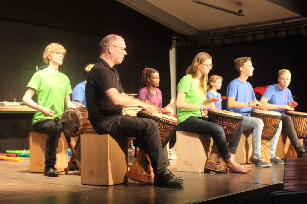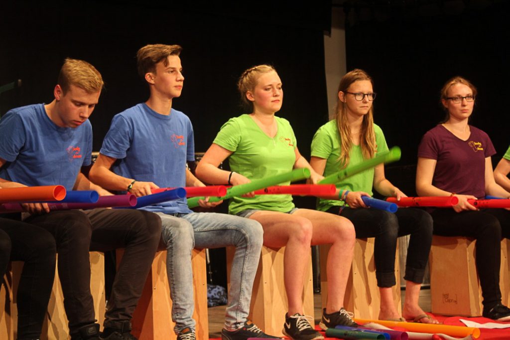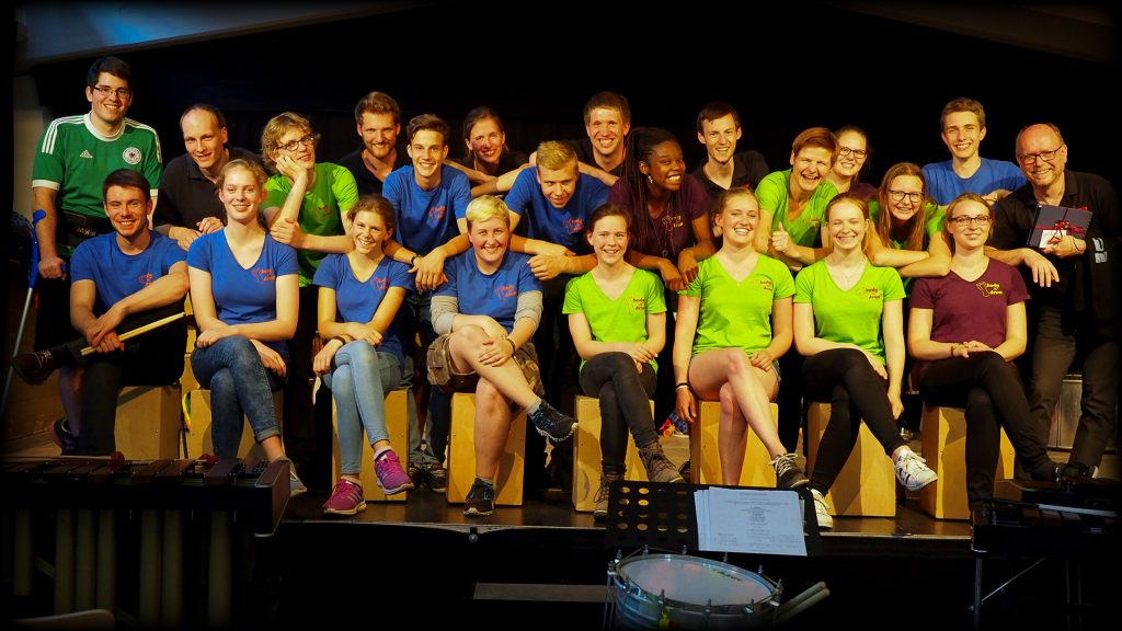 Den Abschluss des Kulturfutters 2017 übernahm wieder die Percussion-AG body & drum, die in diesem Jahr ihr 20-jähriges Bestehen feiert. Herr Flittiger hatte sich bereits bei der Eröffnung des „Kulturfutters“ am Nachmittag nach einem kurzen Auftritt der Gruppe mit einem Blumenstrauß bei Herrn Salomon für sein Engagement und seine Kreativität bedankt.