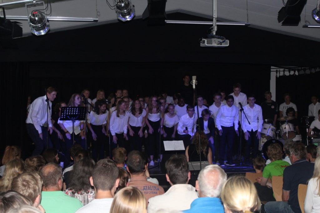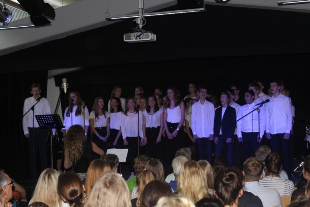 Zahlreiche Gäste versammelten sich in der Aula, um den Klängen der 9. Klassen zu lauschen: Was als tröpfelnder Regen mit aufkommenden Winden begann, steigerte sich zu Sturzbächen mit Blitz und Donner! Die Schüler und Schülerinnen der Klassen 9b und 9d führten mit zwei Solisten und Bandbesetzung den für vierstimmigen Chorsatz arrangierten Popsong der Gruppe Toto, „Africa“, unter der Leitung von Frau Forche-Koltun mit großen Engagement in der Aula auf.