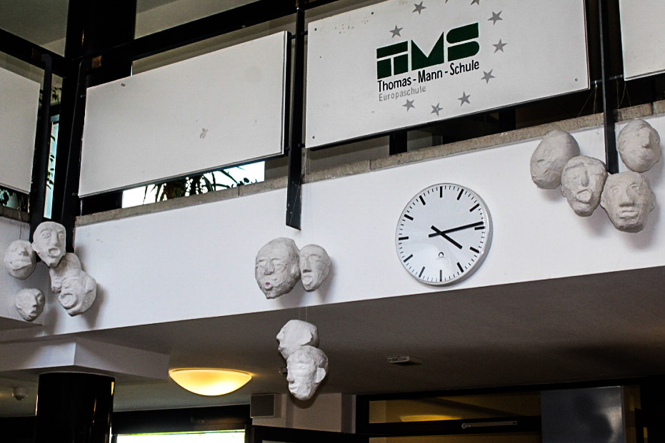 Im Eingangsbereich blickten die „Charakterköpfe“ der 7a skeptisch auf den neuen/alten „Thommy“ herab. Des weiteren gab es dort malerische Stillleben der 9. Klassen, glasierte Tontiere der 6. Klasse sowie Ytong-Skulpturen zum Thema „Leicht und schwer“ des Q1-Jahrgangs zu sehen.
