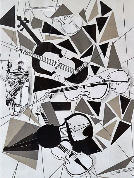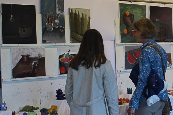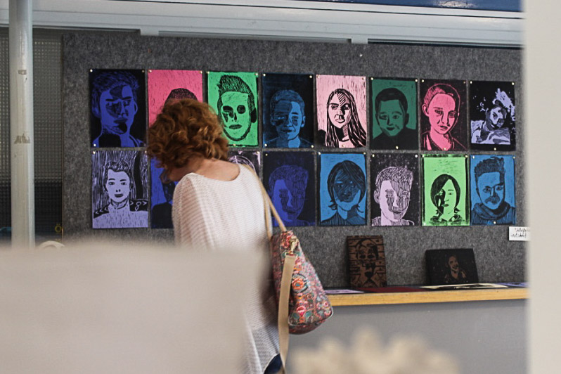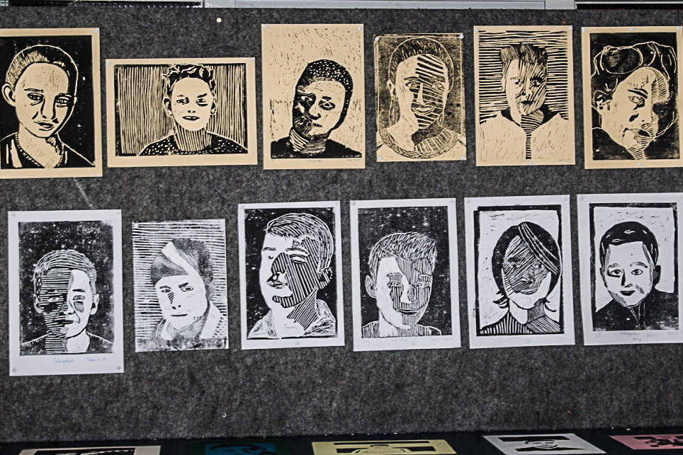 Beim weiteren Rundgang durch die Gänge und die Europahalle konnte man Plastiken, Zeichnungen von Schatzkarten und Burgen (Klasse 5), Linolschnitt-Porträts (Klasse 7 und 9), Graffiti- und Etikett-Entwürfe (Klasse 7), kubistische Studien (E-Jahrgang), Gips-Skulpturen (Klasse 9) , sowie eigene Geschichten als Comic des Q1-Jahrgangs sehen.