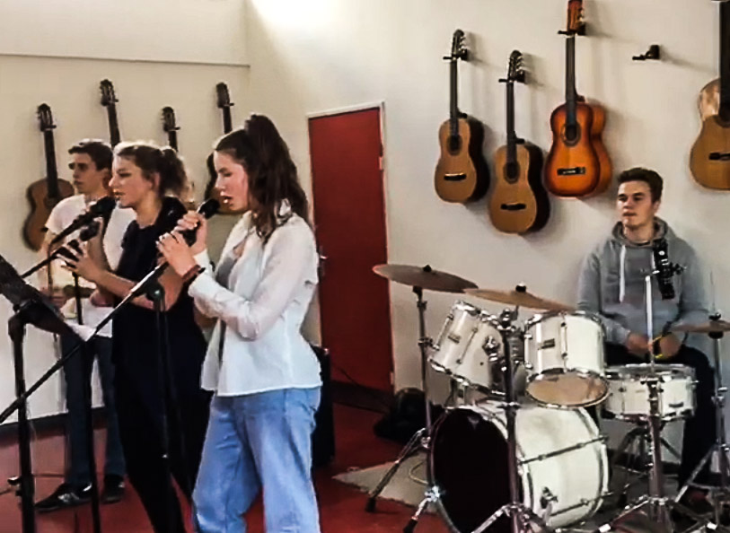 Die Schulband, bestehend aus Jasmina Gonschor (Gesang), Beyza Günsür (Klavier), Felix Schwartz (Schlagzeug), Leonard Roemer ( Gitarre) und Seide Marie-Theres Noffke (Backvocals) brachte den Musikraum zum Grooven! Die Stücke, wie „No Roots“, „Human“, „Spirits“ und „Chasing cars“, die sie unter der Leitung von Frau Forche-Koltun einstudiert haben, begeisterten das lautstark nach einer Zugabe verlangende Publikum.