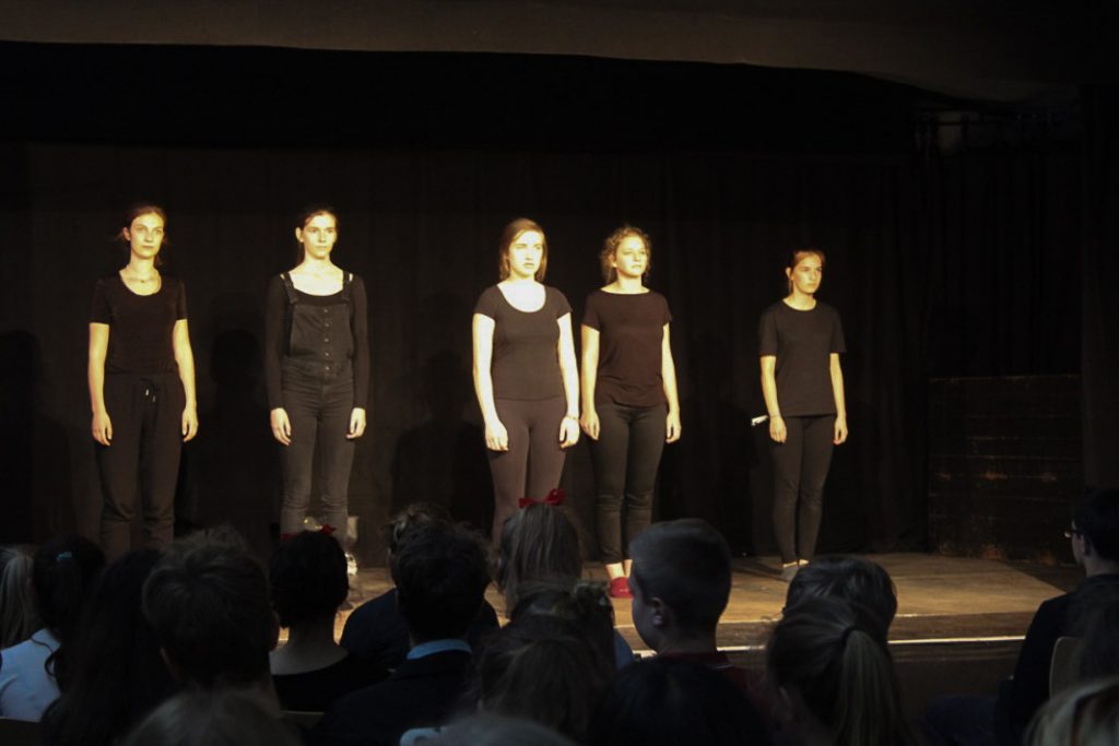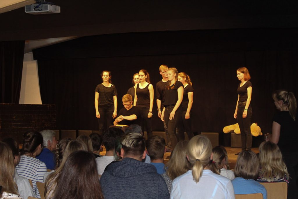 Auch während der Theateraufführungen der DS-Kurse (WPU-Unterricht, Q1-Kurs und AG) von Frau Marten und Frau Heilmann war die Aula mit Zuschauern gefüllt. Die Stücke wurden sowohl im Unterricht erarbeitet, als auch in zahlreichen Extraproben am Nachmittag geübt, wie beispielsweise die selbst geschriebene Version „Who the f*ck is Alice“ des Stückes „Alice im Wunderland“ des WPU-DS-Kurses des 9. Jahrgangs oder auch das Stück „Schluss“ des Q1-Jahrgangs.