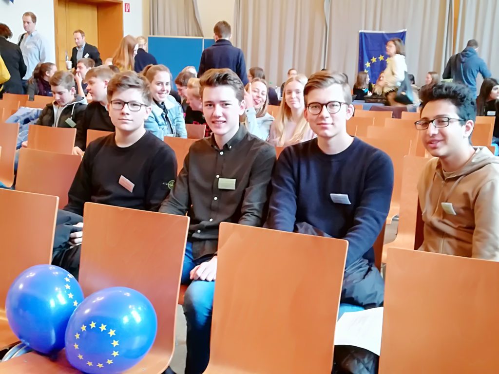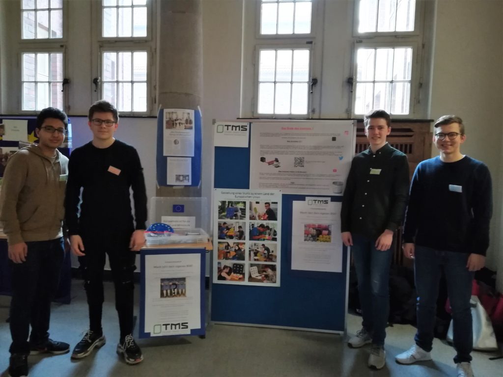Die Juniorbotschafter des Europäischen Parlaments Eliseo, Fynn, Maurice und Arian repräsentierten auf der Regionalkonferenz der Botschafterschulen des Europäischen Parlaments am 24. Januar die TMS. Sie tauschten sich mit Gleichaltrigen anderer Botschafterschulen über ihre Aktivitäten aus und lernten neue Methoden kennen, wie sie ihren Mitschülerinnen und Mitschülern die Aufgaben des Europäischen Parlaments näher bringen können.