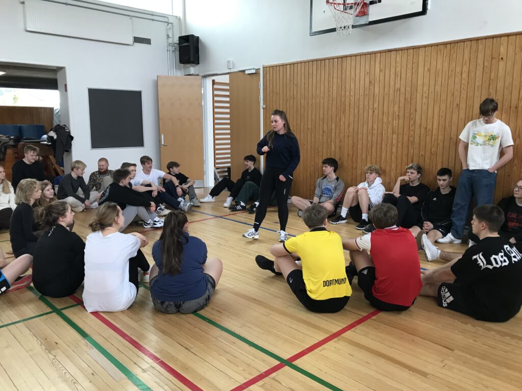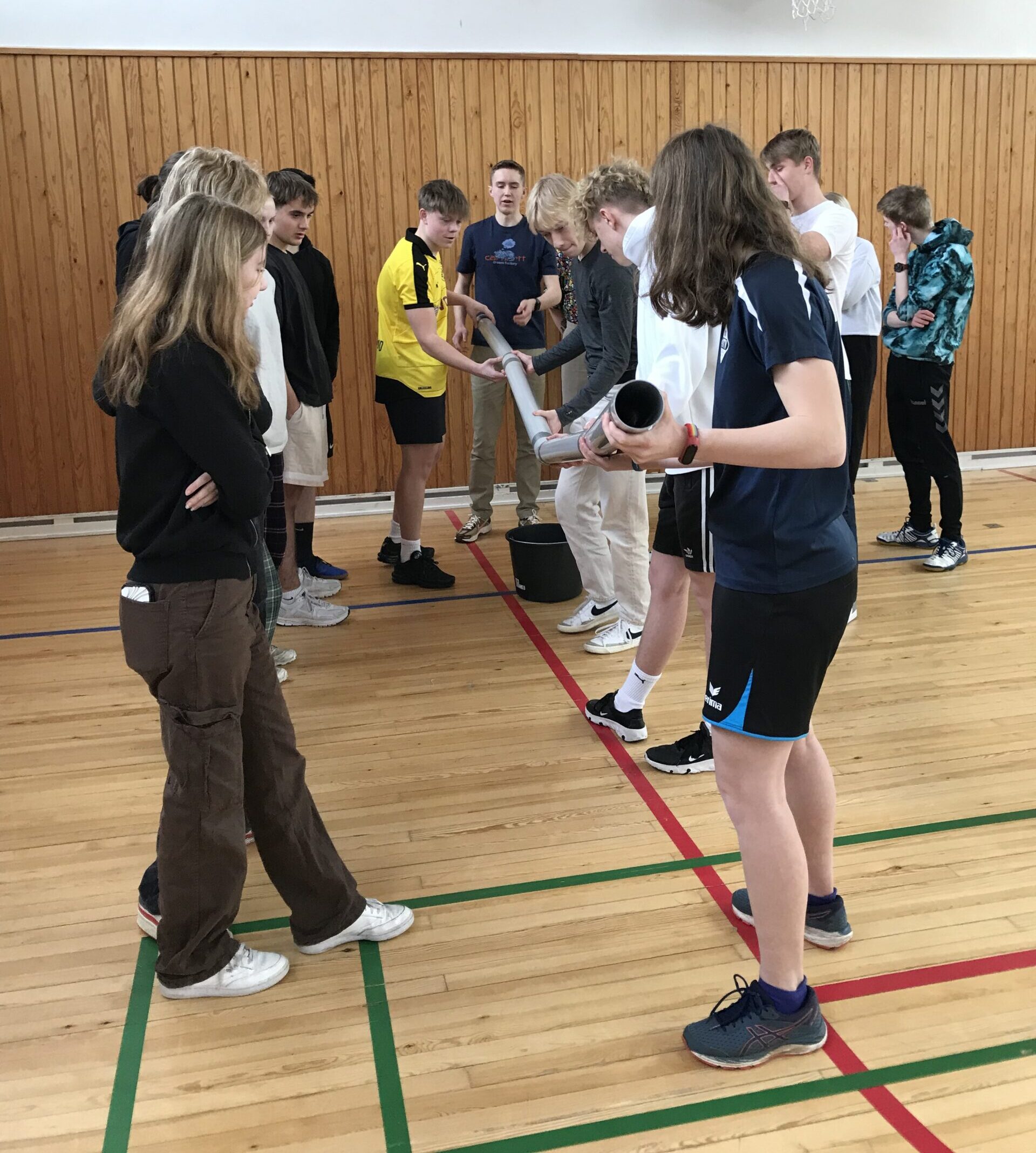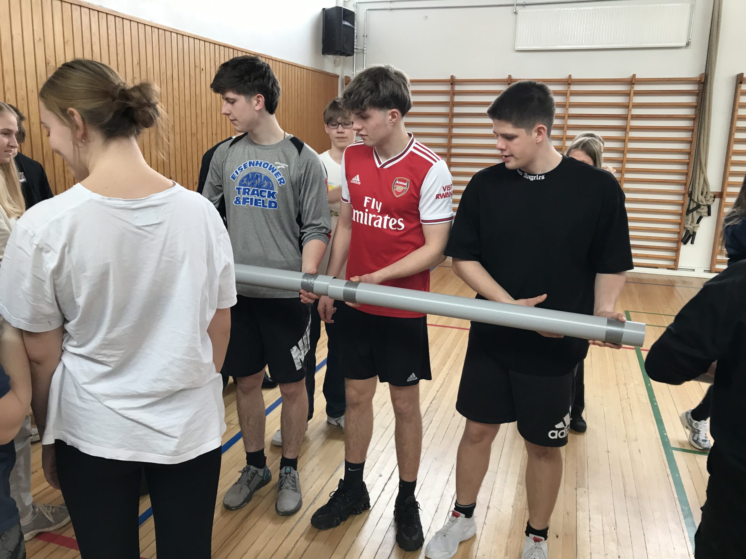 Vor gut drei Monaten sind wir uns an der TMS zum ersten Mal begegnet. Jetzt fand der Gegenbesuch bei unseren Austauschpartnern im Aalborghus Gymnasium statt. Zum Aufwärmen und Wiederannähern stellten uns Stine und Janne, die beiden dänischen Lehrkräfte, nach unserer Ankunft am Sonntag, den 12. März, mehrere kooperative Aufgaben. Zunächst mussten Bälle mit Hilfe von Rohrstücken durch die ganze Länge der Sporthalle transportiert werden. Dabei waren Absprachen notwenig, denn es gab nur vier Rohrsegmente, um die Distanz von 20 Metern zu überbrücken.