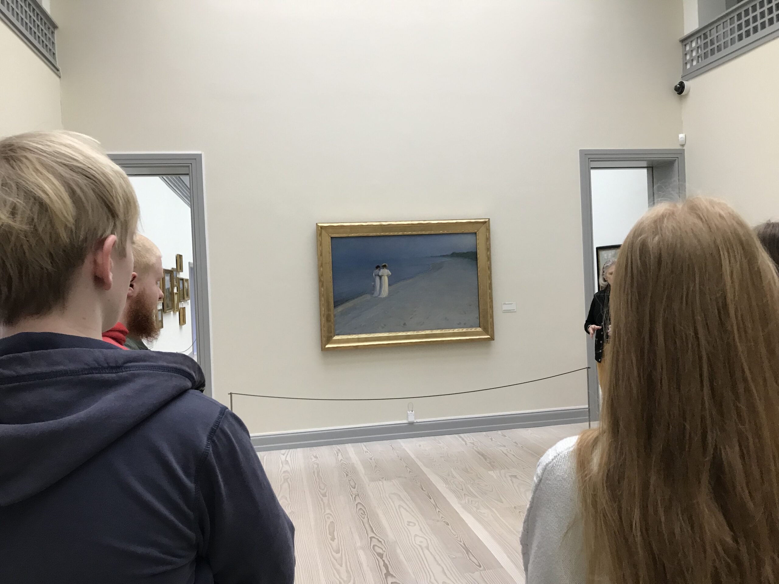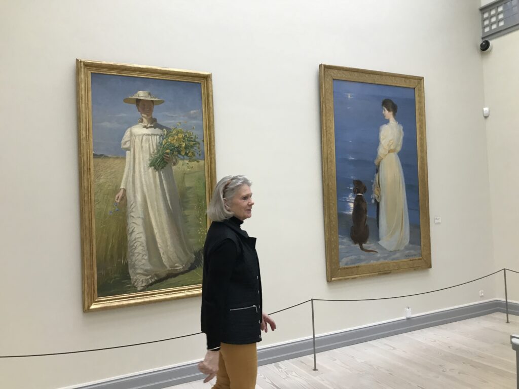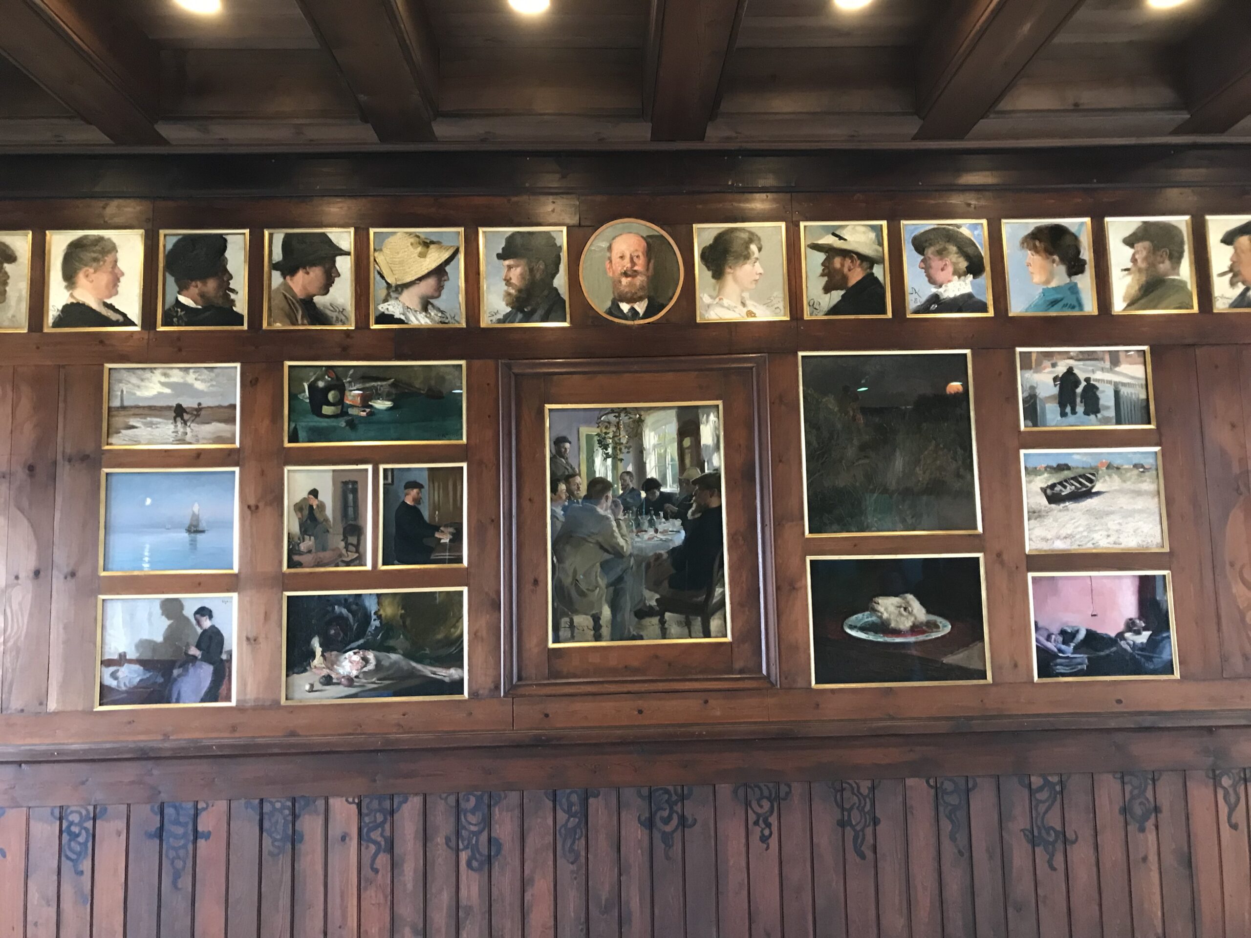 Der gesamte Donnerstag galt einem Besuch in Skagen. Der kleine Ort in Nordjütland mit den typisch gelb gestrichenen Häusern war Ende des 19. Jahrhunderts das Sommerrefugium einer Gruppe von skandinavischen Künstlern, die sich der Plein Air Malerei und dem Impressionismus verschrieben hatten. Sie verkehrten im Brøndums Hof, dem einzigen Hotel am Ort. Da die Künstler oft mit Bildern ihre Rechnungen bezahlten, wuchs die Sammlung des Wirtsehepaares. Die Werke, u.a. die Porträts der Künstler, wurden in die Wandvertäfelung des Speisesaals integriert. Heute befindet sich die Vertäfelung mit allen Kunstwerken im Skagen Museum, durch das wir eine Führung erhielten.