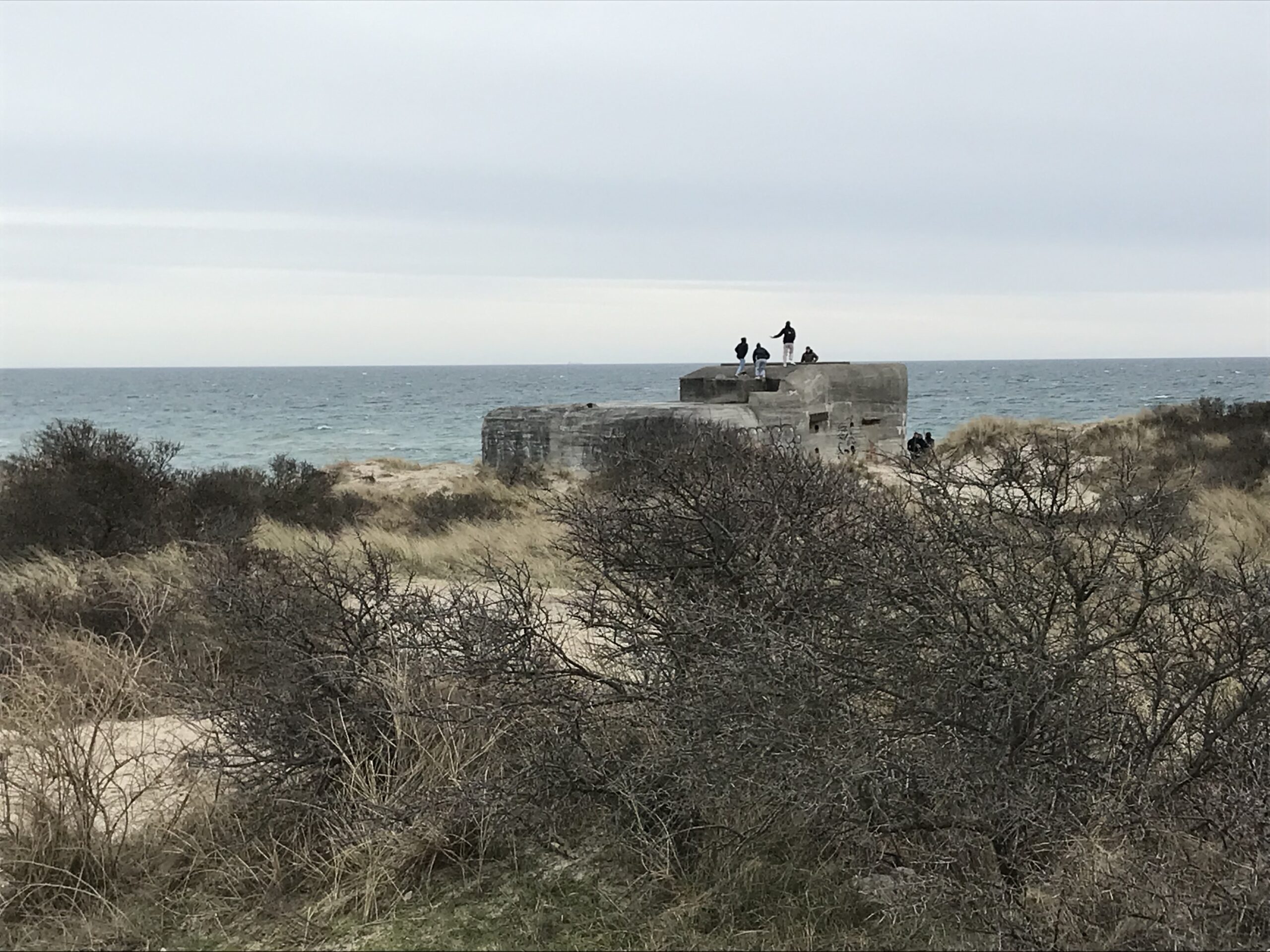 Danach wurde es stürmisch. Wir wanderten zur nördlichsten Spitze Dänemarks, dem Skagerrak, wo Nord- und Ostsee aufeinander treffen. Am Strand auf dem Weg dorthin befinden sich noch Bunker aus dem Zweiten Weltkrieg, Überbleibsel aus einer nicht mehr vorstellbaren kriegerischen Geschichte unserer beider Länder.
