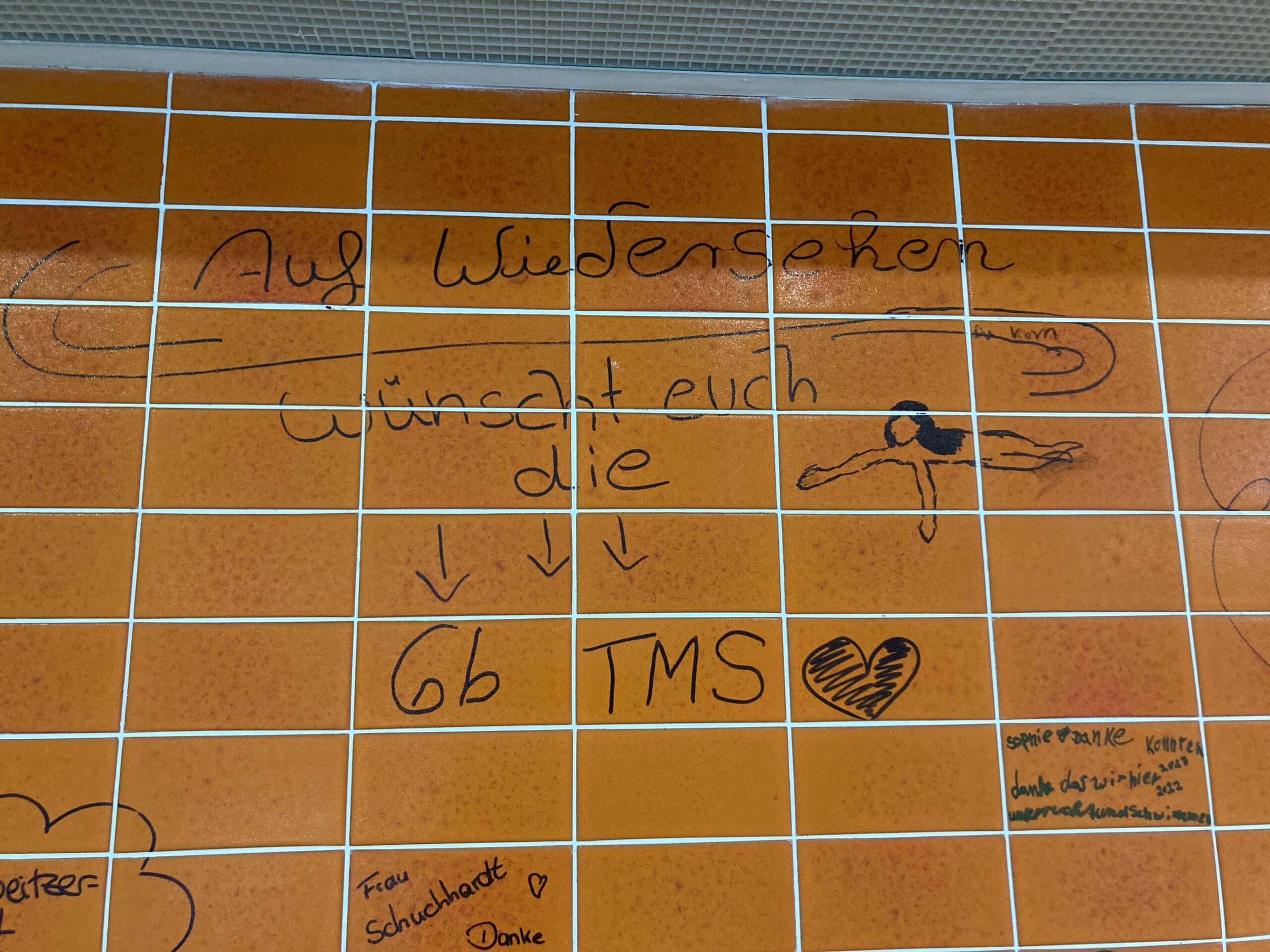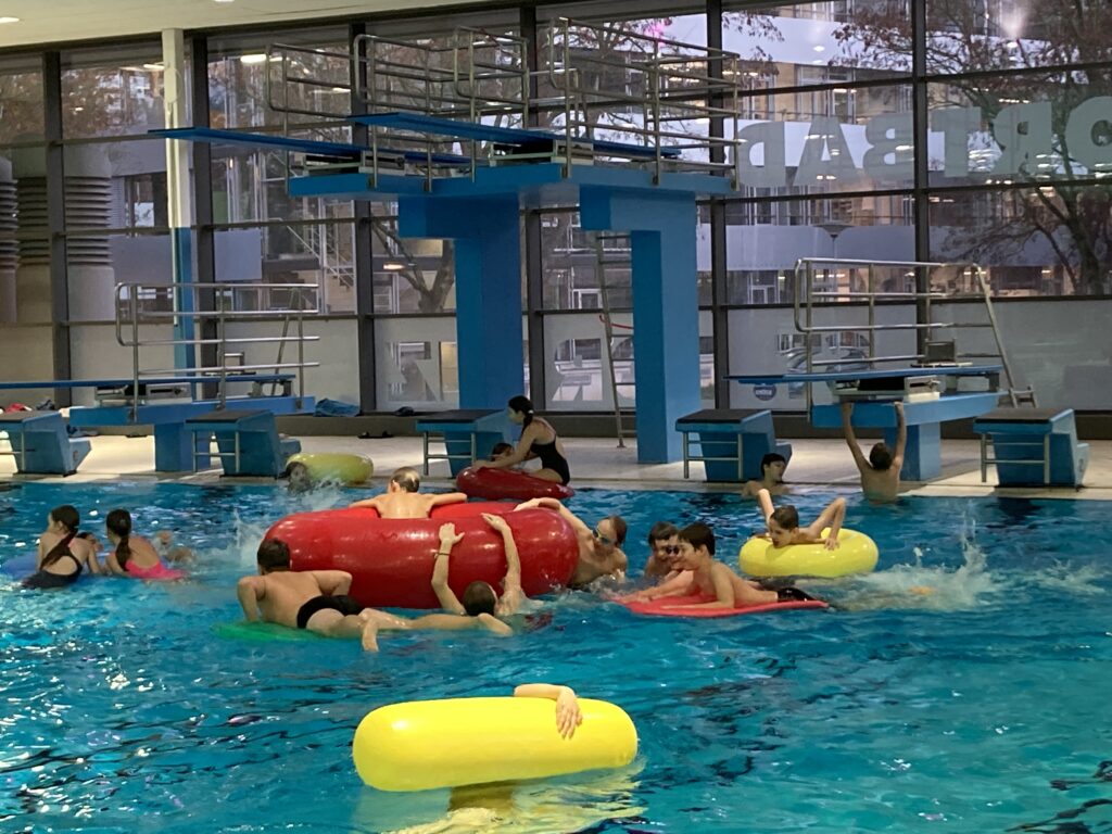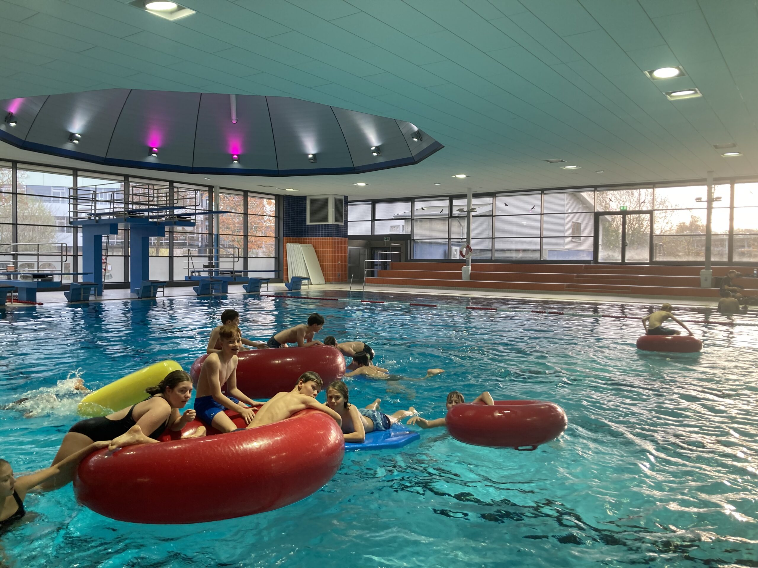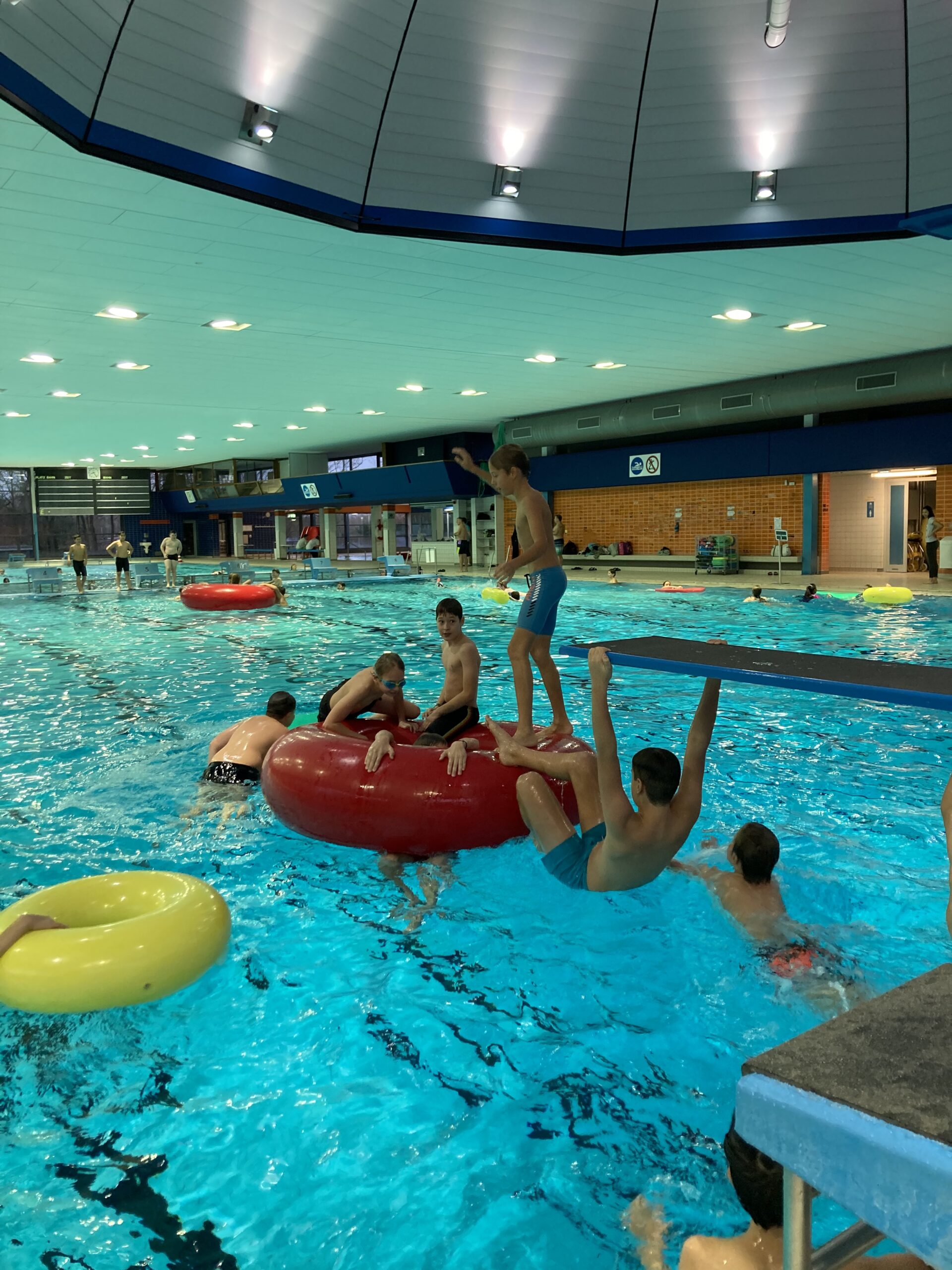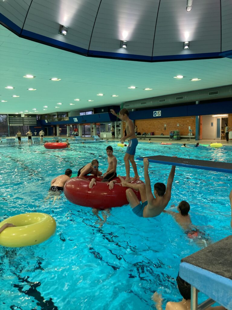 Die Sport-Fachschaft verabschiedet sich von der Schwimmhalle in der Ziegelstraße, die jetzt aufgrund der Sanierung geschlossen wird. Im Januar startet der Schwimmunterricht dann in der Schwimmhalle in der Schmiedestraße. Das letzte Mal Schwimmen in der „alten“ Schwimmhalle war für unsere 6. Klassen ein Event.