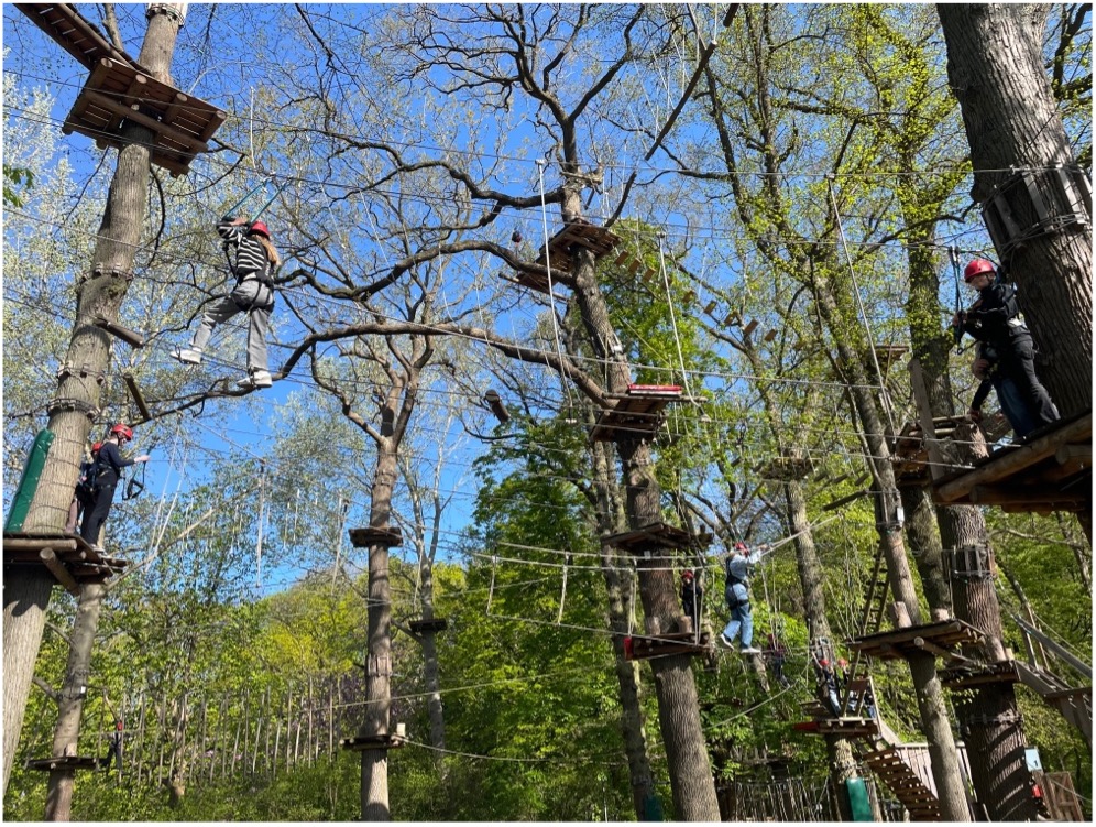 Vor Ort wurden die Schülerinnen und Schüler zunächst von einem Trainer professionell in die Sicherheitsvorkehrungen eingewiesen. Nach dem Anlegen der Klettergurte und Helme folgten ausführliche Anleitungen zum sicheren Verhalten während des gesamten Aufenthalts im Kletterwald.