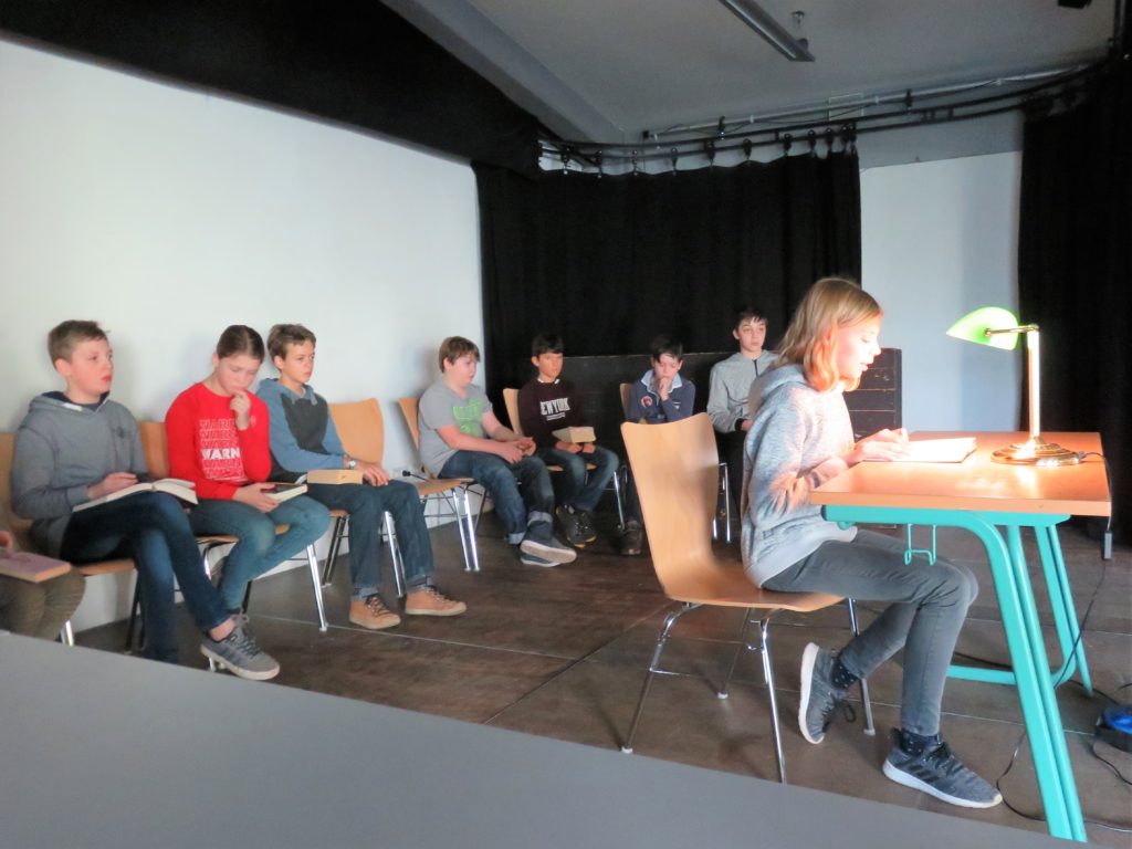 Die Vortragenden hatten auf der Bühne kein Mikrofon zur Verfügung und so bedurfte es einer gewissen Stimmgewalt, um den Vortrag zu Gehör zu bringen. Und auf Seiten des Publikums war Konzentration und Ruhe gefordert, was am Ende des Vormittags und nach dem Schwimmunterricht gar nicht so leicht war.