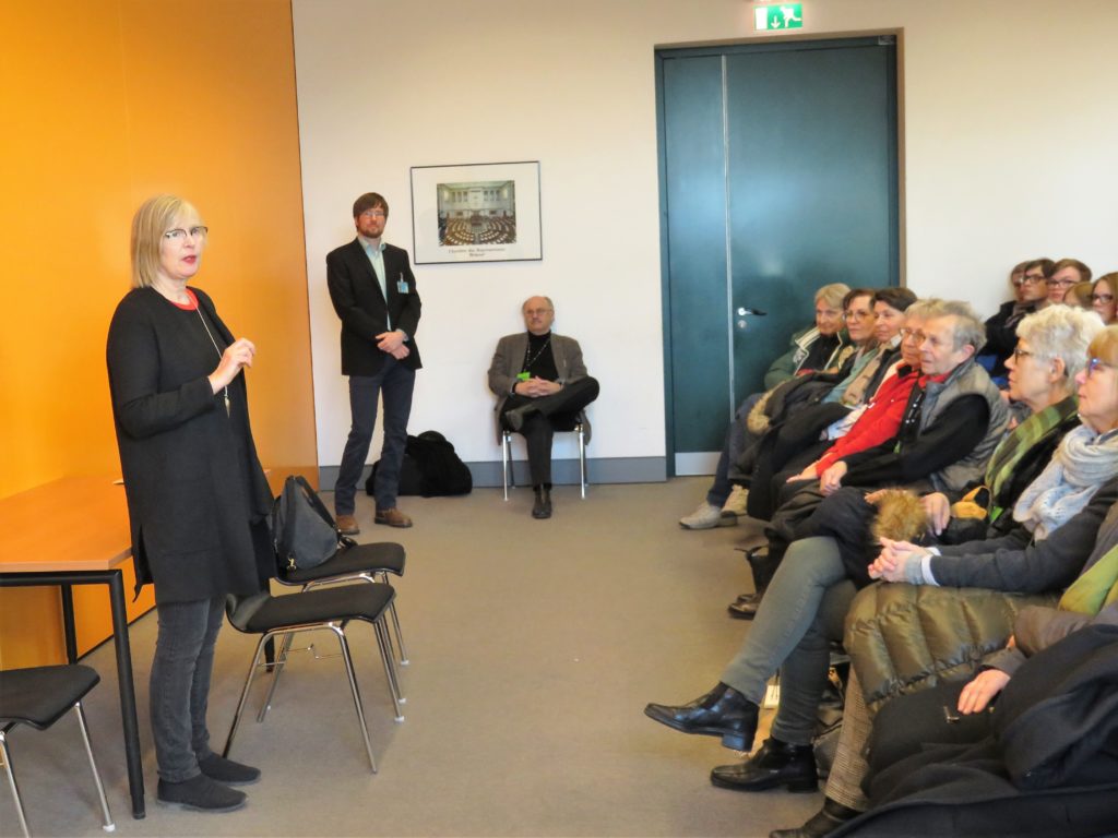 Das Gespräch mit der Abgeordneten Gabriele Hiller Ohm drehte sich einerseits um das eben Beobachtete, andererseits um die alle Besucher bewegende Frage, ob der Eintritt der SPD in eine Große Koalition sinnvoll sei und wie wohl die am nächsten Tag endende Abstimmung der Parteimitglieder ausgehen würde. Gabi Hiller-Ohm sprach sich für die GroKo aus und erläuterte auch, warum bei ihr seit dem Wahlabend ein Sinneswandel vorgegangen sei. Sie ging davon aus, dass auch eine knappe Mehrheit in der SPD für die GroKo erreicht wird. Mit unseren Schülerinnen und Schülern diskutierte sie darüber, wie sich die SPD erneuern und mehr Profil gewinnen könne. Sehr bedenklich fanden alle, dass in den Umfragewerten die AfD noch vor der SPD liegt. Hier waren wir wirklich am Puls der Zeit.