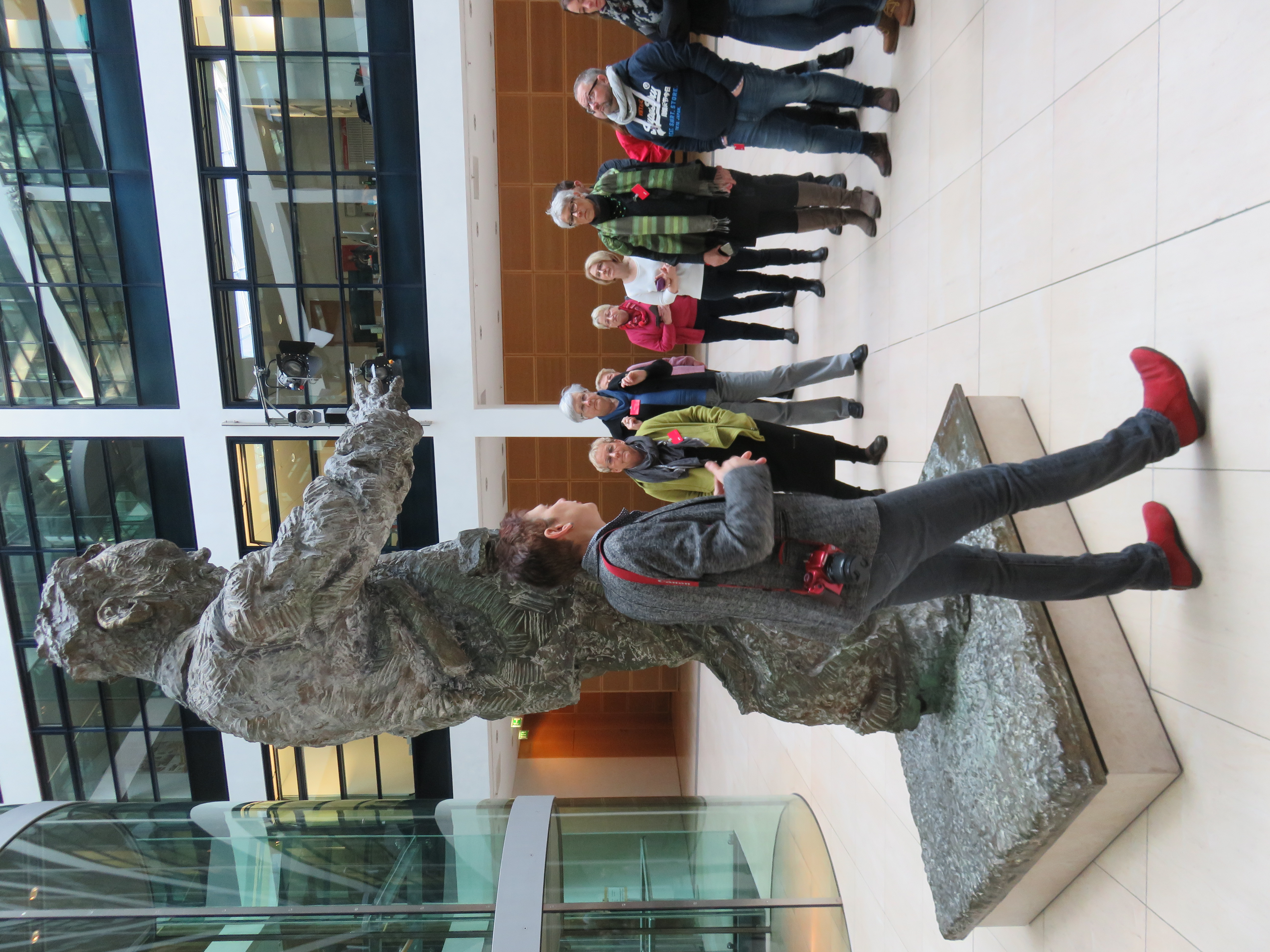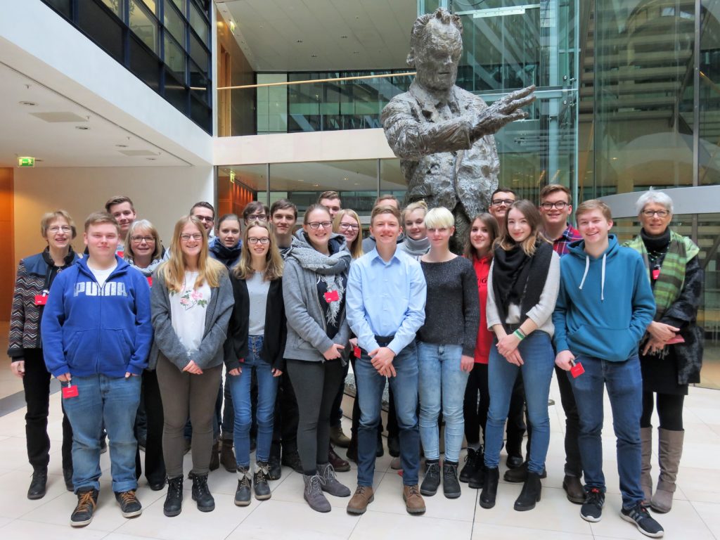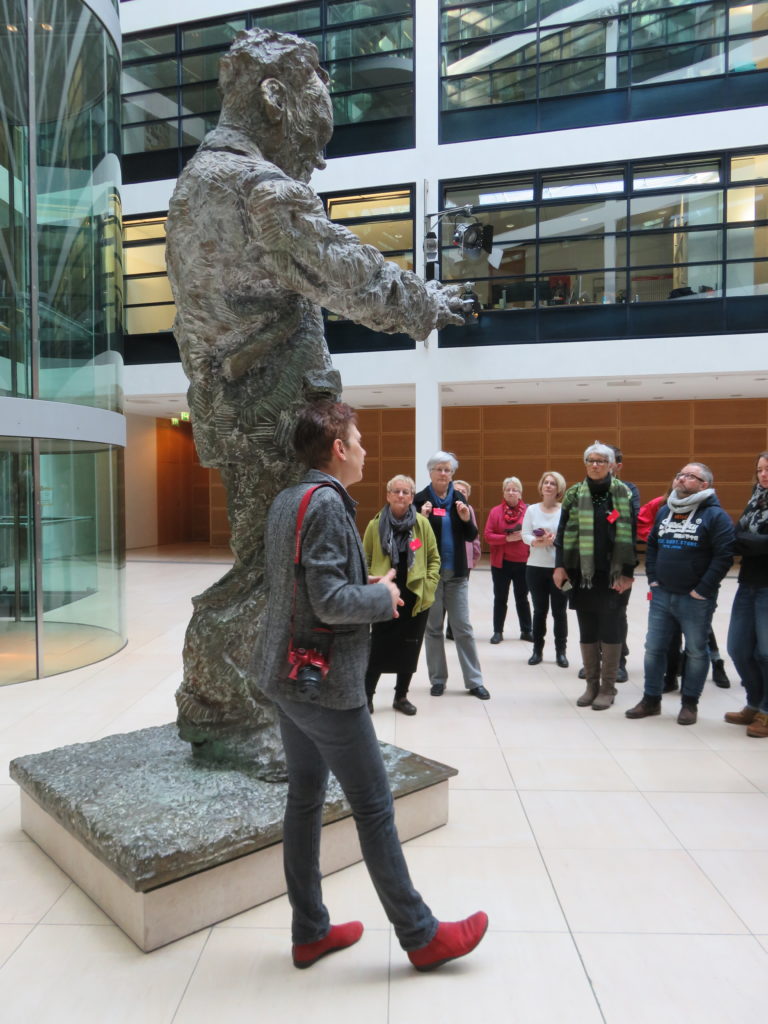 Das Thema „Zukunft der SPD“ stand auch am Freitagmorgen im Mittelpunkt unseres Besuchs im Willy-Brandt-Haus, der SPD-Parteizentrale. Die Mitarbeiterin Brigit Brüns vermittelte uns die Ideen, die hinter der Architektur des beeindruckenden Gebäudes stehen (Transparenz, Ökologie), und ging ausführlich auf die überdimensionale Willy-Brandt-Statue im Atrium des Hauses ein. Der Künstler Rainer Fetting habe Willy Brandt als Menschen dargestellt, der auf andere zuging, der seine Ecken und Kanten hatte, aber auch politische Visionen entwickelte und umsetzte.