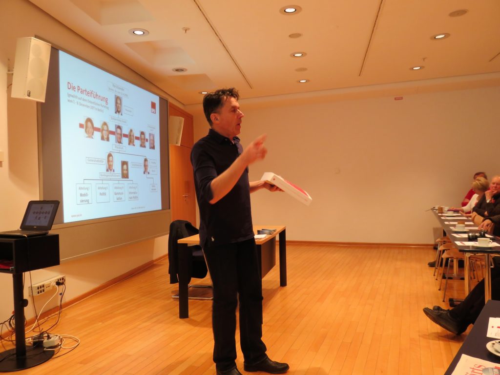 Im Tagungsraum im 4. Stock sahen wir zunächst einen Werbefilm der SPD, ein Alleinstellungsmerkmal dieser Partei, wie uns Dr. Jürgen Große erklärte. In der folgenden Stunde diskutierte er mit uns über die Lage der SPD, ging den Ursachen des Stimmungstiefs auf den Grund und skizzierte Lösungsansätze, die aber nicht alle überzeugten. Als er das dicke Buch in die Luft hielt und erklärte, dass das die Änderungsanträge für das Wahlprogramm auf dem letzten SPD-Parteitag gewesen seien, wurde allen klar, wie viele Diskussionen es in der Partei gibt und dass viel Papier bedruckt werden muss, bis ein Konsens zwischen den verschiedenen Parteiflügeln erreicht wird. „Das macht eben eine Volkspartei aus“, meinte der Referent, der während des Wahlkampfes auf Berliner Plätzen den Bürgern Rede und Antwort gestanden hatte.