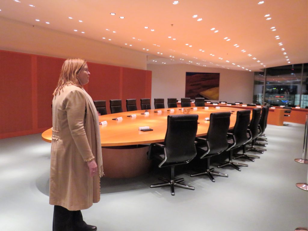 Das Bundeskanzleramt besuchten wir abends, als die Büros in den Seitentrakten weitgehend verlassen waren, aber die Kanzlerin noch im 7. Stock in ihrem riesigen Büro arbeitete. Da ging dann die Dame, die uns im Stock darunter das Haus und die Aufgaben des Kanzleramtes erläuterte, in den Flüsterton über und behielt die Tür von Frau Merkels Büro im Auge.