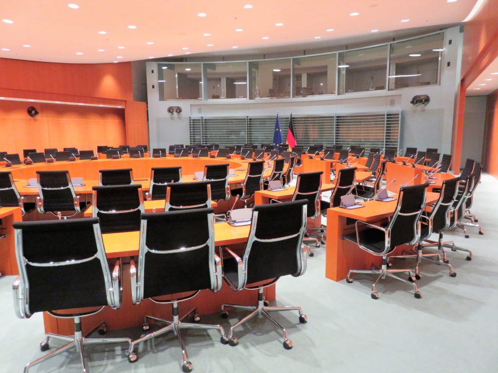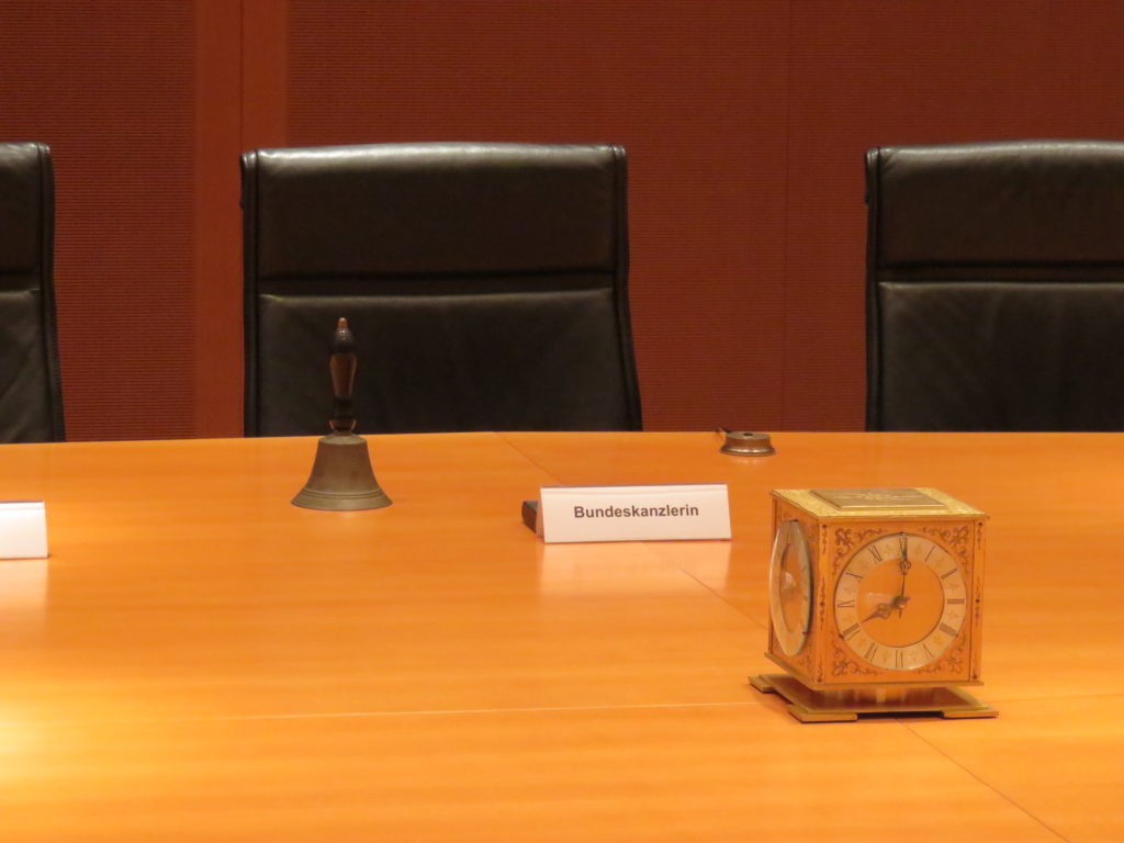 Im Kabinettssaal, in dem die Regierungschefin mit den Ministerinnen und Ministern immer mittwochs von 9.30 bis ca. 10.30 Uhr tagt, fiel auf, dass die Lehne des Kanzlerstuhls nicht höher als die anderen ist. Die Glocke auf dem Tisch vor der Kanzlerin wird nur einmal zu Beginn einer neuen Legislaturperiode geläutet, was dann wohl Mitte März 2018 der Fall sein wird, wenn der Bundestag Angela Merkel wieder zur Kanzlerin wählt. Die würfelförmige Uhr in der Mitte des Tisches ist ein Geschenk des ersten Bundeskanzlers Konrad Adenauer, der damit sein Kabinett disziplinierte, denn mit dem Zifferblatt auf jeder Seite kann auch der redseligste Minister erkennen, wann knappe Zeit abgelaufen ist.