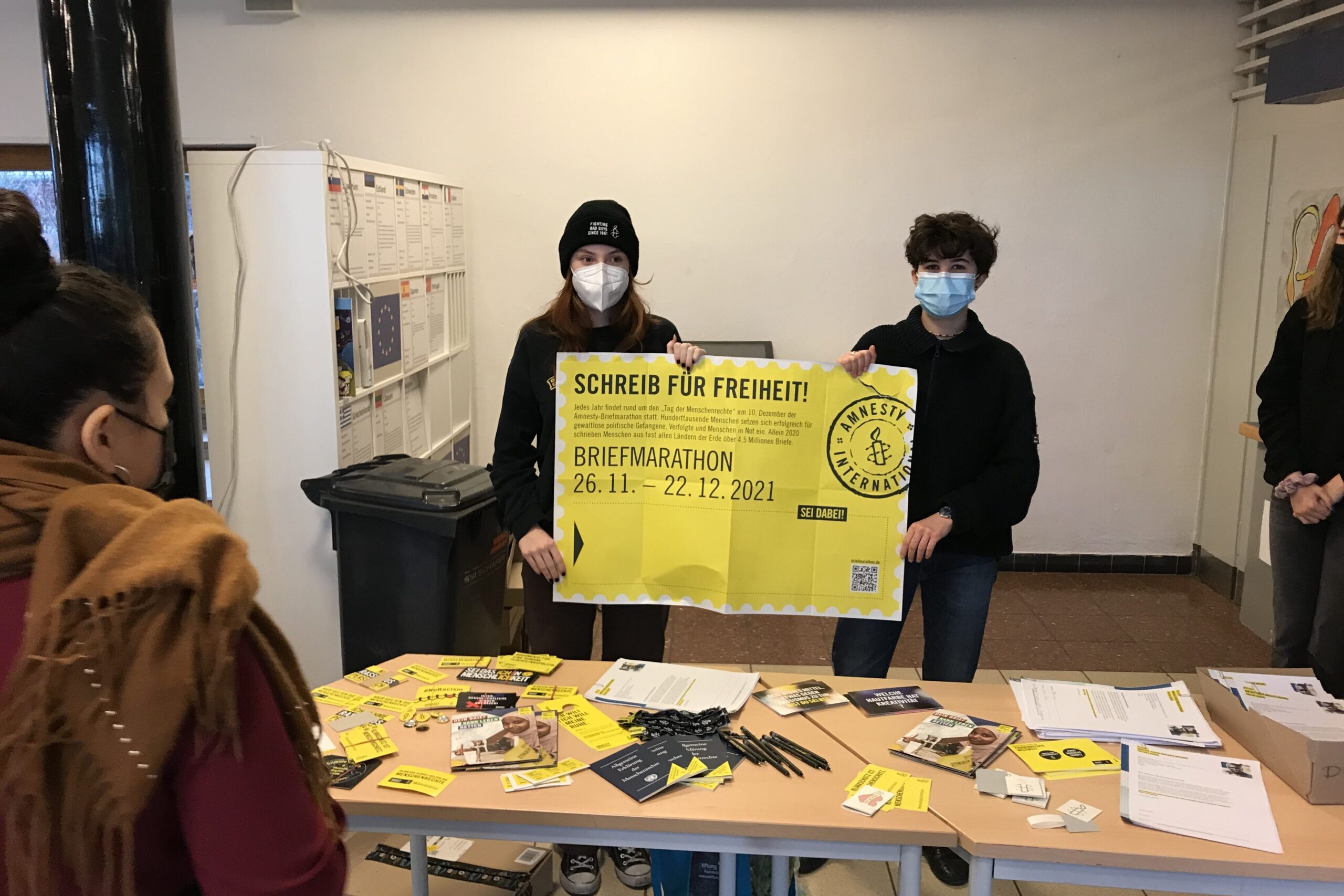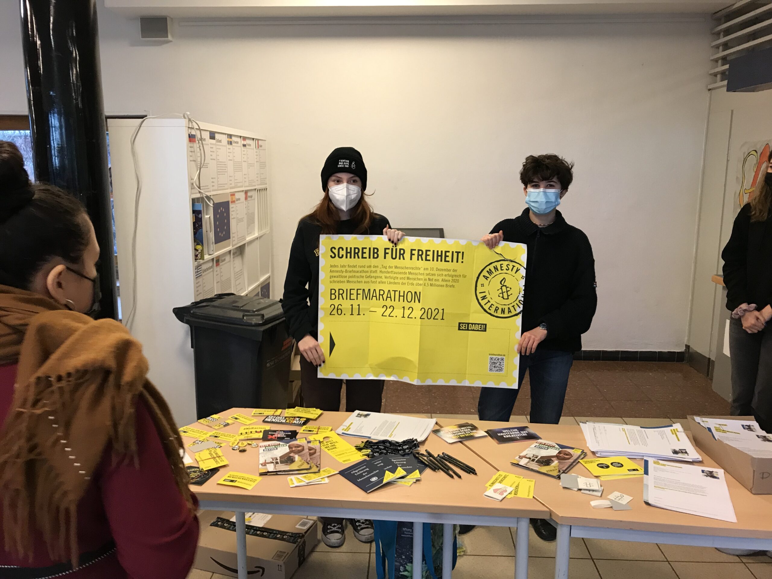 Wie in jedem Jahr haben wir, die Schüler:innenvertretung den Internationalen Tag der Menschenrechte am 10. Dezember zum Anlass genommen, mit Amnesty International einen Briefmarathon in unserer Schule zu veranstalten. Das Schicksal der zehn Betroffenen erfordert unsere Solidarität. Ihre Menschenrechte werden verletzt. Mit den Unterschriften fordern wir die jeweilige Regierung auf, die Menschenrechten dieser Personen zu achten. Wir haben dieses Jahr 891 Unterschriften gesammelt und hoffen, dass die öffentliche Aufmerksamkeit und die Vielzahl der Briefe die Regierungen zum Einlenken bringt.
