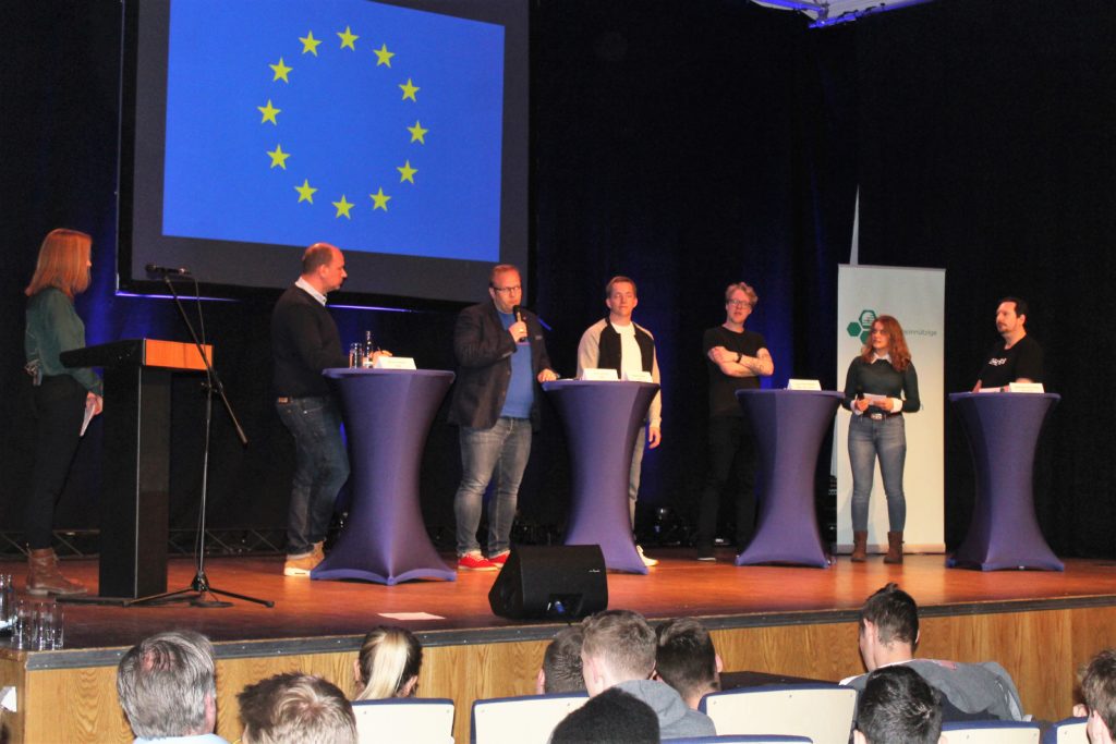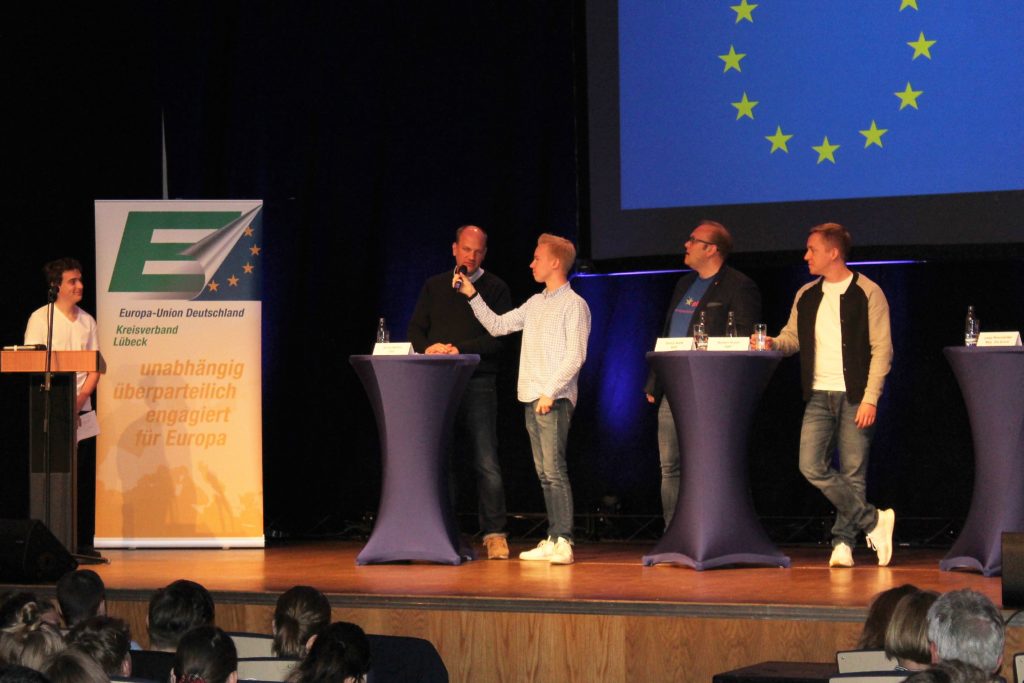 Auf Initiative der Gemeinnützigen und der Europa Union Schleswig-Holstein diskutierten die Schülerinnen und Schüler unseres Q1-Jahrganges am 24. April mit den Kandidaten unterschiedlicher Parteien für die bevorstehende Wahl des Europäischen Parlamentes im Kolosseum.