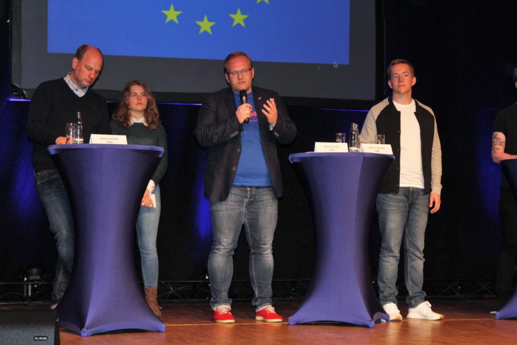 Vier unserer Juniorbotschafter, Maurice, Arian, Franka und Eliseo, hatten sich bereits im Januar mit Vertretern anderer Europaschulen getroffen, um Fragen zu den drei Themenkomplexen „Umweltschutz“, „Europa und die Welt“ und „Unsere Chance Europa- Möglichkeiten für junge Menschen in der EU“ vorzubereiten. Antworten erhielten sie von Niclas Herbst ( CDU), Enrico Kreft ( SPD), Lasse Petersdotter ( Grüne), Helmer Krane ( FDP) und Sebastian Kai Ising ( Die Linke).