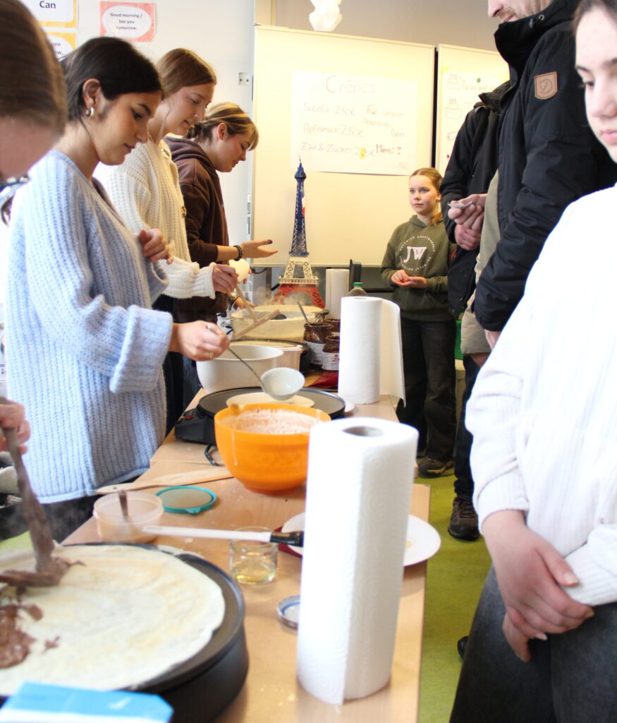 Umlagert waren auch der Bücherflohmarkt der Literatur-AG mit Frau Koschel, die Komplimente-Werkstatt und der Crêpes-Verkauf im Französisch-Raum.