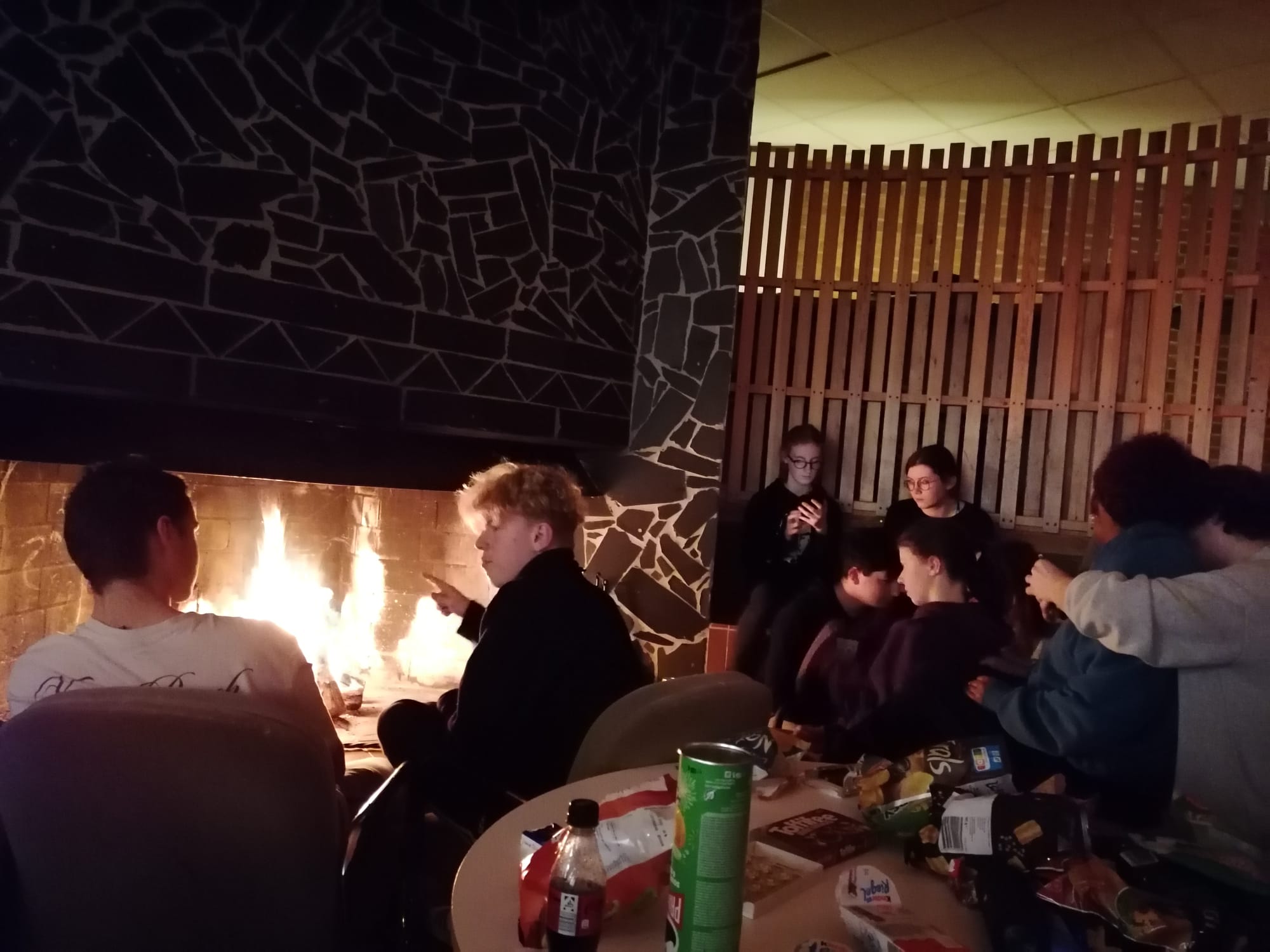 Gut durchblutet kamen wir in die Jugendbegegnungsstätte zurück und begannen bald wieder zu proben. Vor dem Abendessen waren wir dann sehr zufrieden mit unserer Arbeit und hatten unser Repertoire an Liedern deutlich erweitert, sodass am Abend selbst keine weitere Probe mehr notwendig war und wir ihn gemütlich ausklingen lassen konnten.  Im Gruppenraum mit großem Feuer im Kamin versammelten wir uns mit reichlich Snacks, vielen Liedern, die zum Mitsingen einluden, in der Playlist und vor allem guter Laune. Im Laufe des Abends wurden Tischkicker und Tischtennisplatte (auch von den Lehrkräften) intensiv bespielt und in der gelösten Atmosphäre fingen einige auch an zu tanzen. Gegen halb 2 schließlich machten sich auch die letzten nach einer schon recht erschöpften Phase des Am-Feuer-Sitzens auf den Weg ins Bett.
