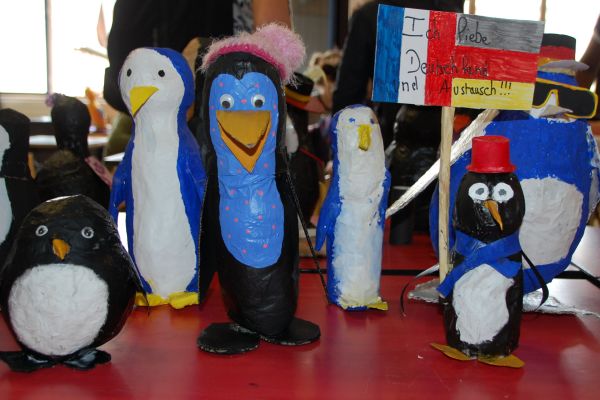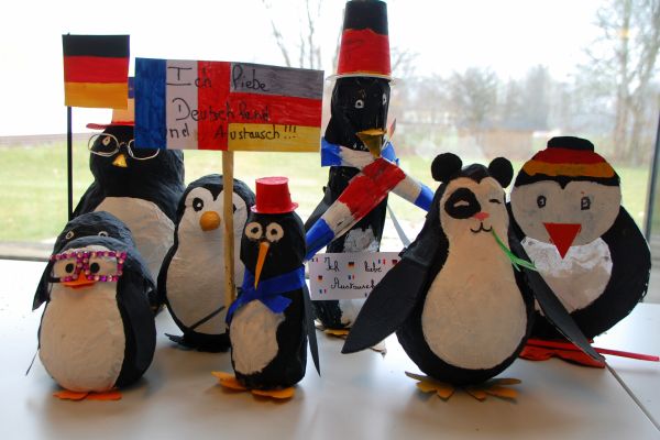 Von besonderer Bedeutung bei so einem Austausch ist natürlich der Austausch selbst. Und wo kann dieser besser gelingen als bei der gemeinsamen Arbeit am Projekt oder als Gast in einer deutschen bzw. französischen Familie? Ausgetauscht wurde dabei vieles: unter anderem Vokabular, Essgewohnheiten, Freizeitbeschäftigungen, unterschiedliche Arten von Begrüßungen, Eigenheiten des jeweiligen Schulsystems. Aus den Pinguinen wurden nun echte Individuen: kleine Pinguine, große Pinguine, harte Pinguine aus Holz, in Farbeimer gefallene Pinguine, modebewusste Pinguine, fröstelnde Pinguine mit Wollmütze, austauschliebende Pinguine, europäische und natürlich deutsch-französische Pinguine.