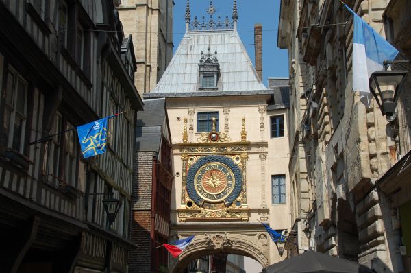 in Rouen den Uhrenturm (Gros Horloge) mit der großen vergoldeten Uhr,