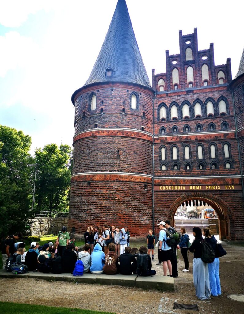 Am Montag haben wir uns in der Schule getroffen und verschiedene Kennlernspiele gespielt. Bei einem davon mussten wir uns als Gruppe auf eine Plane stellen und sie umdrehen, ohne den Boden zu berühren – das hat Teamarbeit und Kommunikation erfordert. Anschließend haben wir über Demokratietheorie und Parlamentarismus gesprochen. Dabei ging es darum, wie demokratische Systeme funktionieren und welche Rolle Parlamente dabei spielen. Wir haben außerdem die Wahlprogramme in Polen und Deutschland verglichen und Gemeinsamkeiten und Unterschiede herausgearbeitet – zum Beispiel in Themen wie Sozialpolitik, Umwelt oder Europa. Danach sollten wir in Gruppen kreative Videos zu fiktiven Parteien gestalten. Wir haben uns Namen, Logos und zentrale Forderungen ausgedacht. Am Nachmittag fand eine Stadtrallye durch Lübeck statt. Dabei haben wir verschiedene wichtige Gebäude besichtigt, unter anderem das Buddenbrookhaus und die Marienkirche. (Bericht von David)