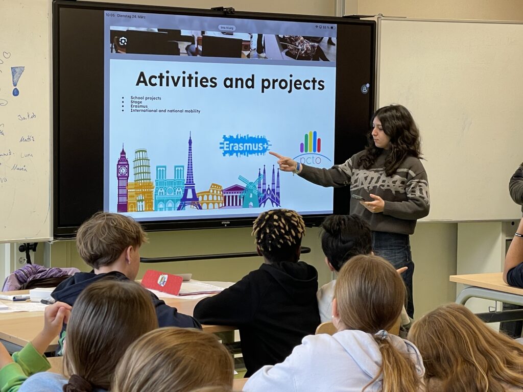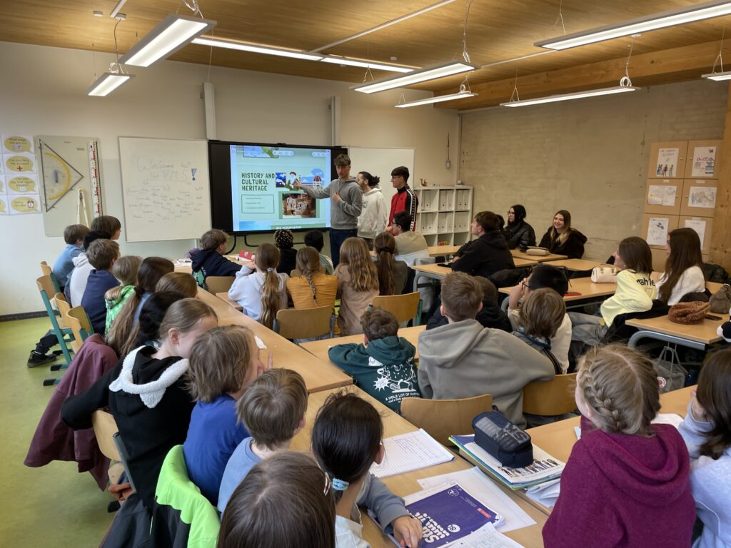 Im Englischunterricht hatten sich die Kinder im Vorfeld Fragen überlegt, die sie ihren italienischen Gästen stellen wollten. Diese wiederum präsentierten vier vorbereitete Vorträge zu unterschiedlichen Themen. Die Klasse 5d verfolgte die Präsentationen aufmerksam und zeigte großes Interesse, was sich auch in den anschließenden Fragen widerspiegelte.