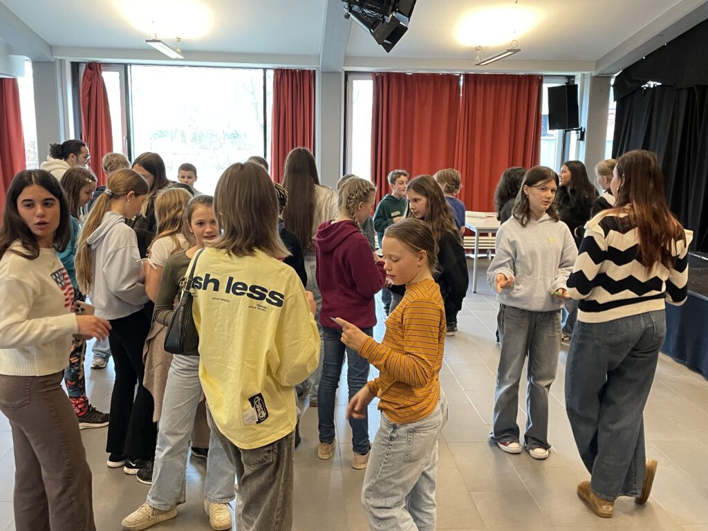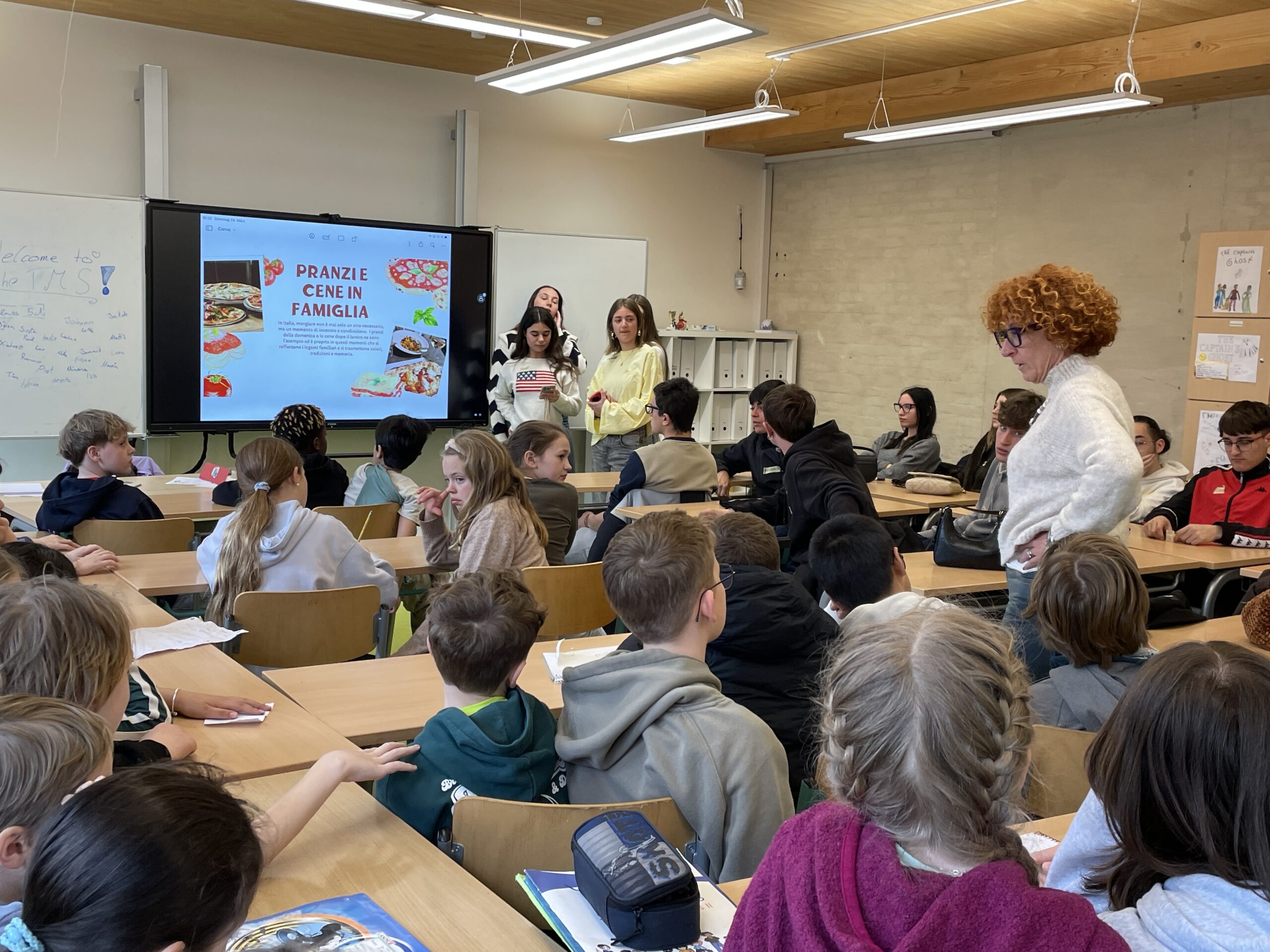 Nach den Präsentationen entwickelte sich eine lebhafte Fragerunde. Unsere jüngsten Schülerinnen und Schüler nutzten die Gelegenheit, den ca. 6 Jahre älteren Gästen aus Italien neugierig und mutig viele Fragen zu stellen – von Schule und Freizeit bis hin zu persönlichen Interessen.
