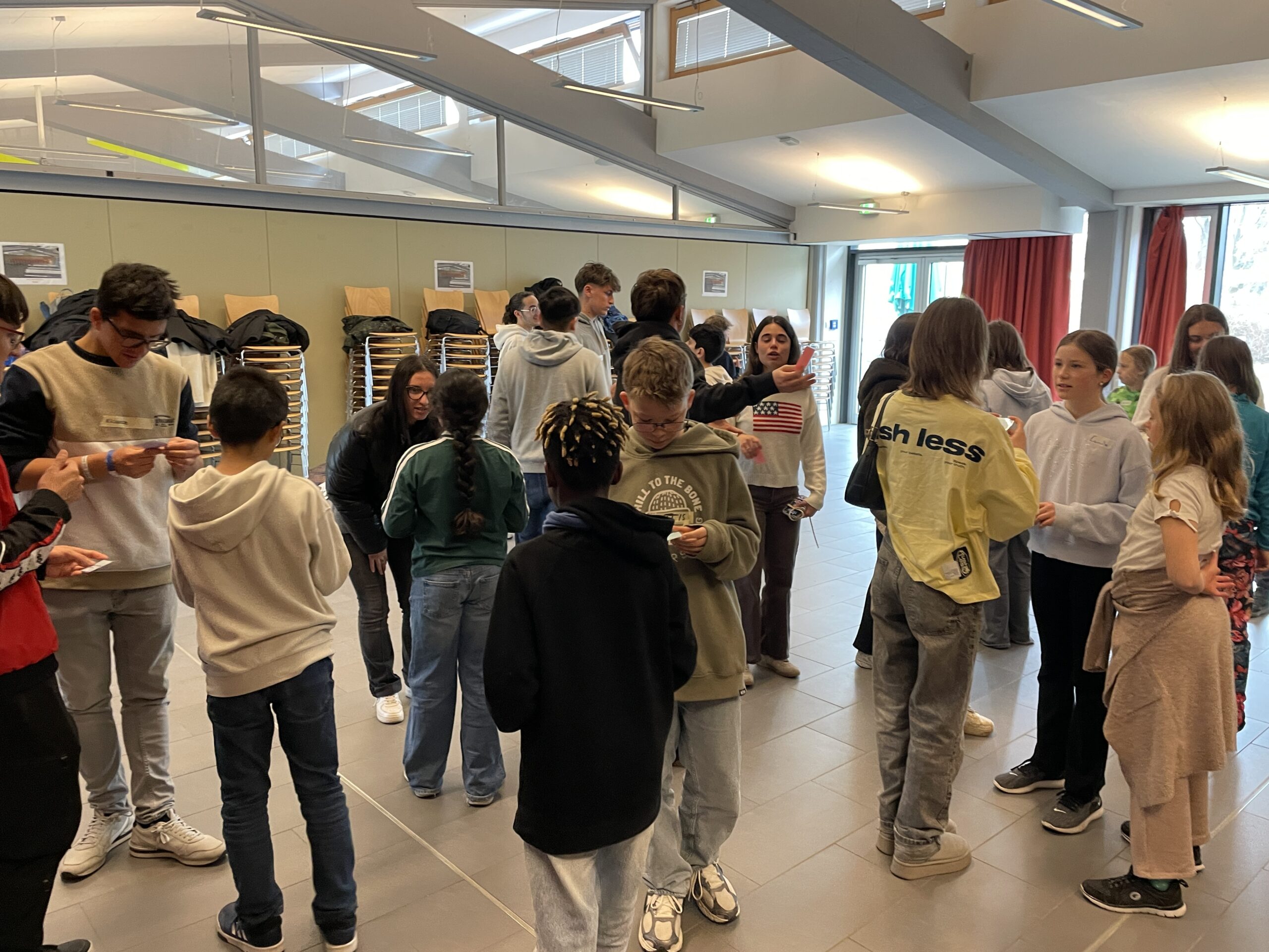 Zum Abschluss trafen sich alle Beteiligten noch einmal in der Aula zu einer weiteren Fragerunde mit Flashcards, die für zusätzliche Interaktion und Gesprächsanlässe sorgten.