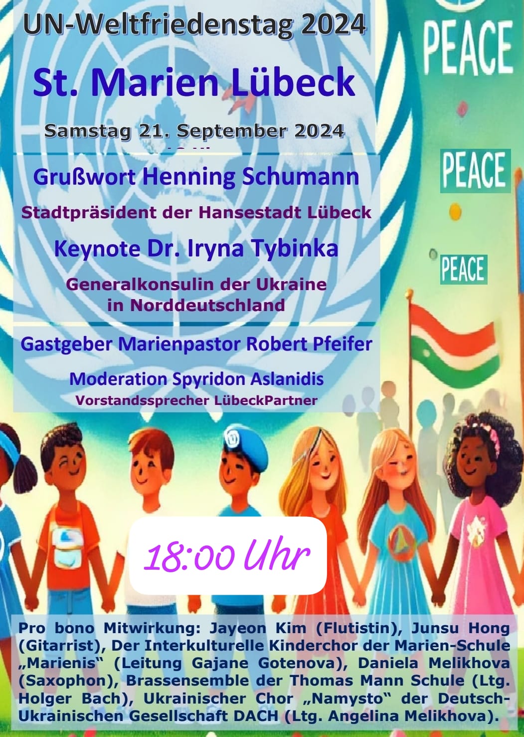 Zum Internationalen Tag des Weltfriedens hatten Pastor Robert Pfeiffer und Spyridon Aslanidis, Vorsitzender de Vereins der Partnerstädte Lübeck, in die Marienkirche geladen. Zum Programm aus Texten und musikalischen Darbietungen trug auch unser Blechbläserensemble bei und beeindruckte das Publikum.