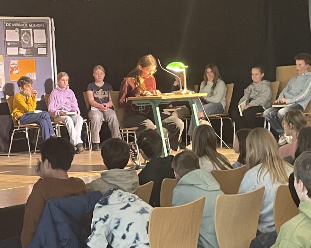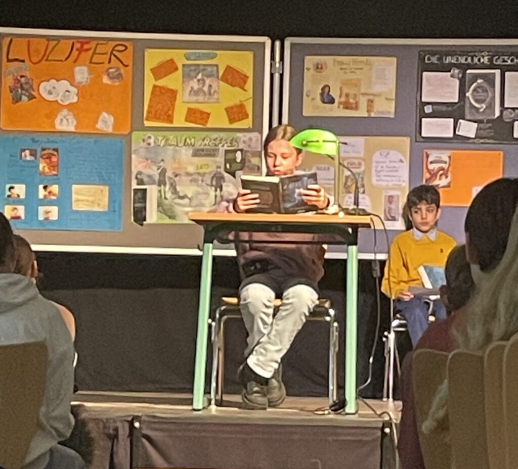 Teil dieser Präsentation war auch, Passagen des Buches vorzulesen, um einen Eindruck von Handlung und Sprache des Romans zu vermitteln. Auf dieser Grundlage wurde dann abgestimmt, wer die Klasse beim Schulwettbewerb im Vorlesen vertreten sollte.