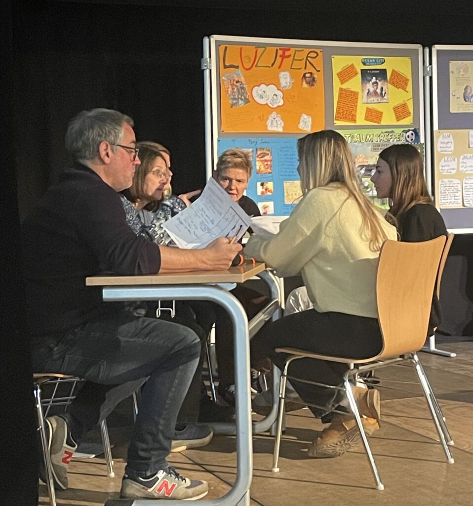 Lustig, spannend, verträumt … welche Schülerin und welcher Schüler hat den Charakter des Textes am besten getroffen und mit Stimme, Lautstärke und Tempo die Geschichte zum Leben erweckt? Die Jury, zu der die Deutschlehrkräfte gehörten sowie Fabienne und Emma aus der Q1a, die die Veranstaltung moderierten, tauschten ihre Einschätzungen aus.