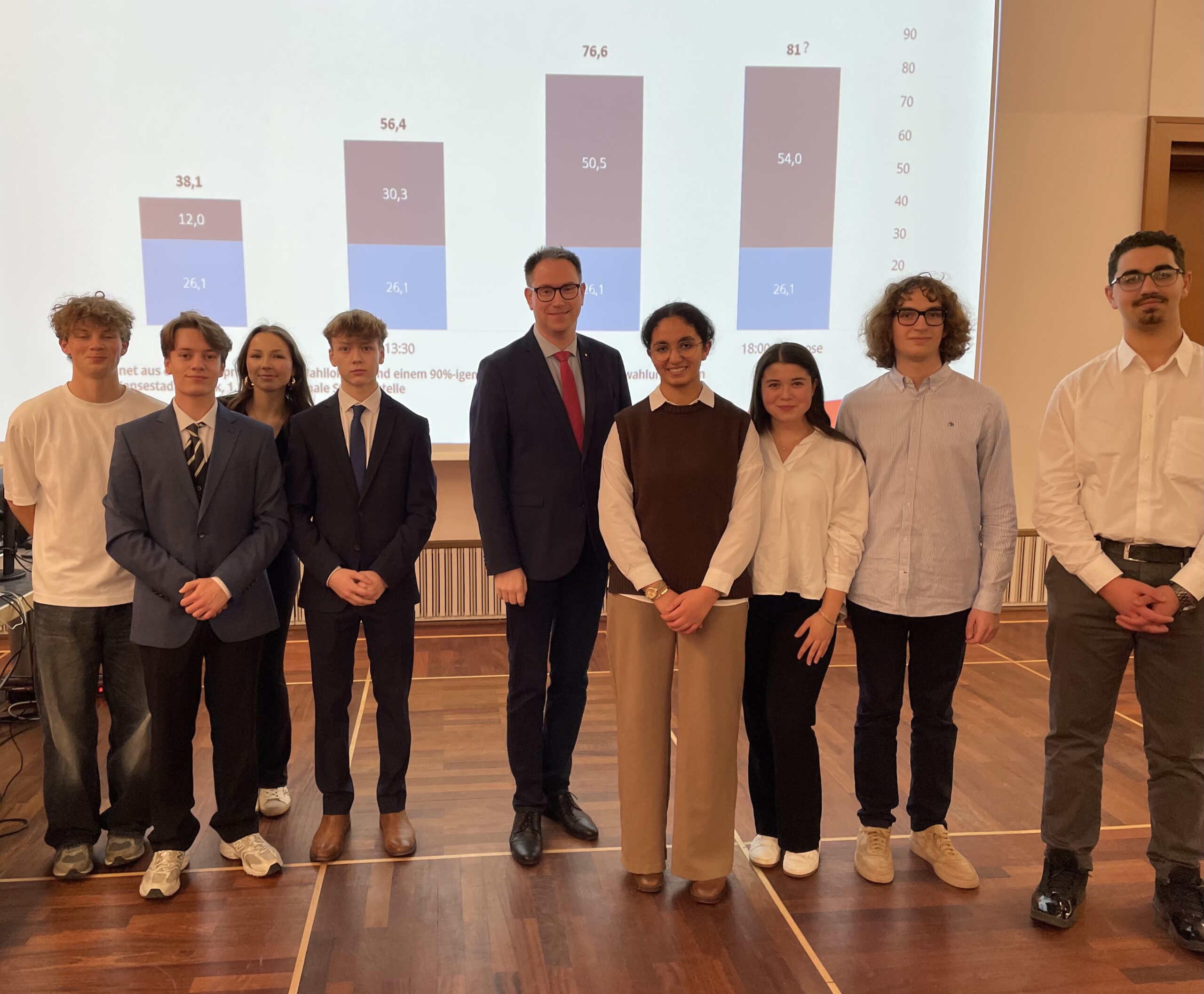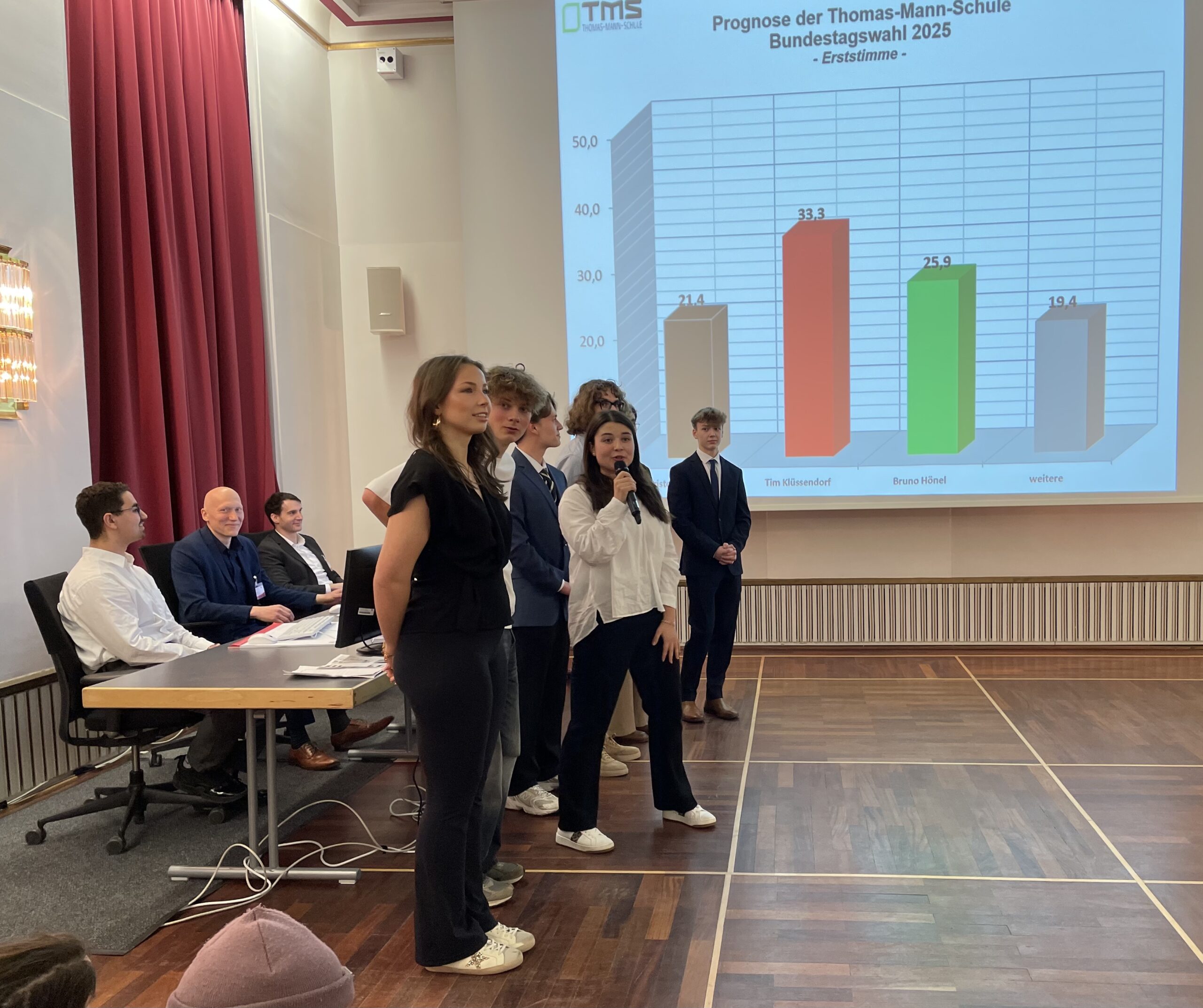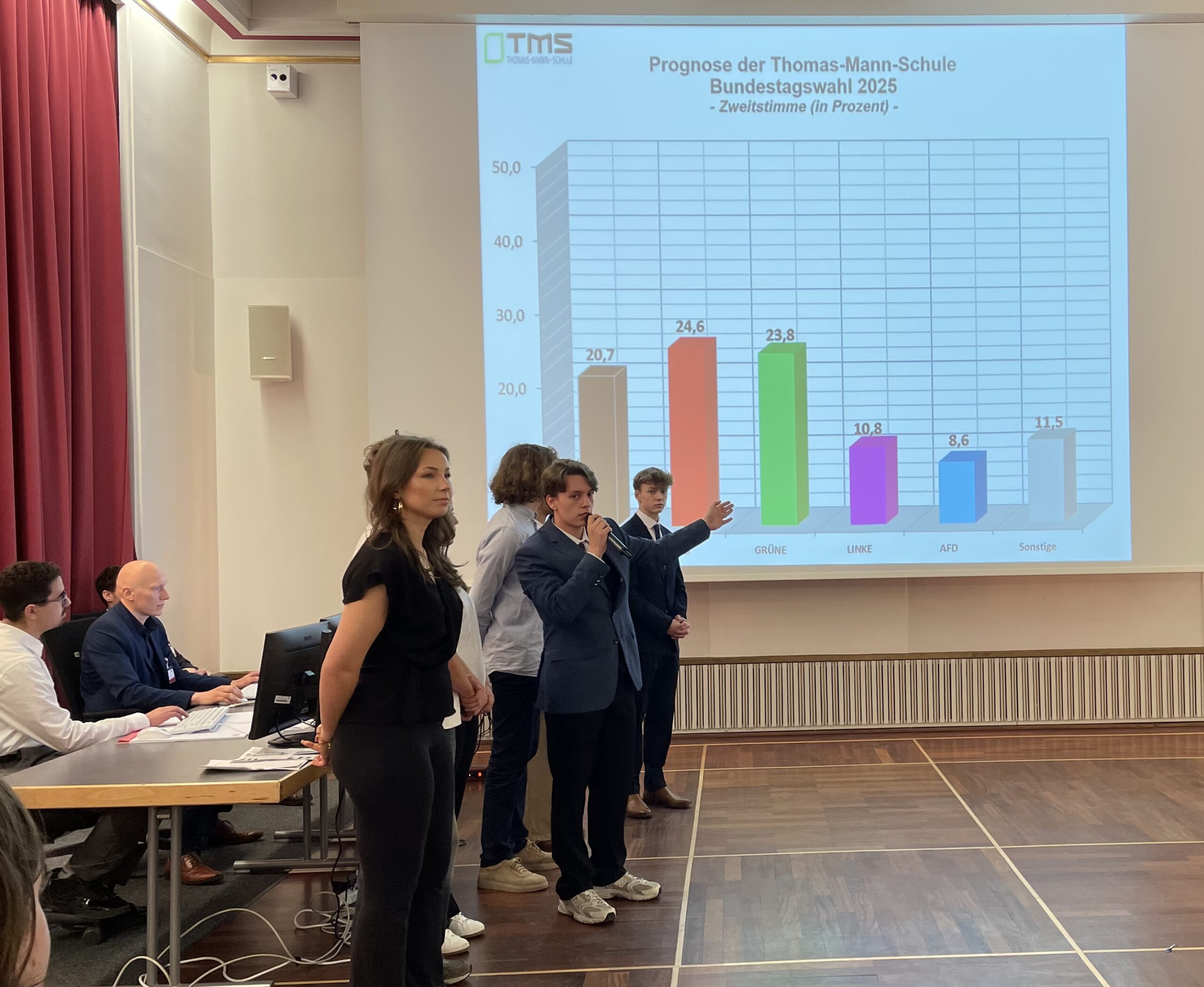 Danach präsentiert Alessandro das hochgerechnete Zweitstimmenergebnis für die Parteien, das deutlich vom Bundesergebnis abweicht. Mit 24,6 % liegt laut Hochrechnung unserer Schüler die SPD knapp vor den Grünen mit 23,8 %. Bei den von den Schülern erhobenen Ergebnissen schneidet die AfD unter 10 % ab.