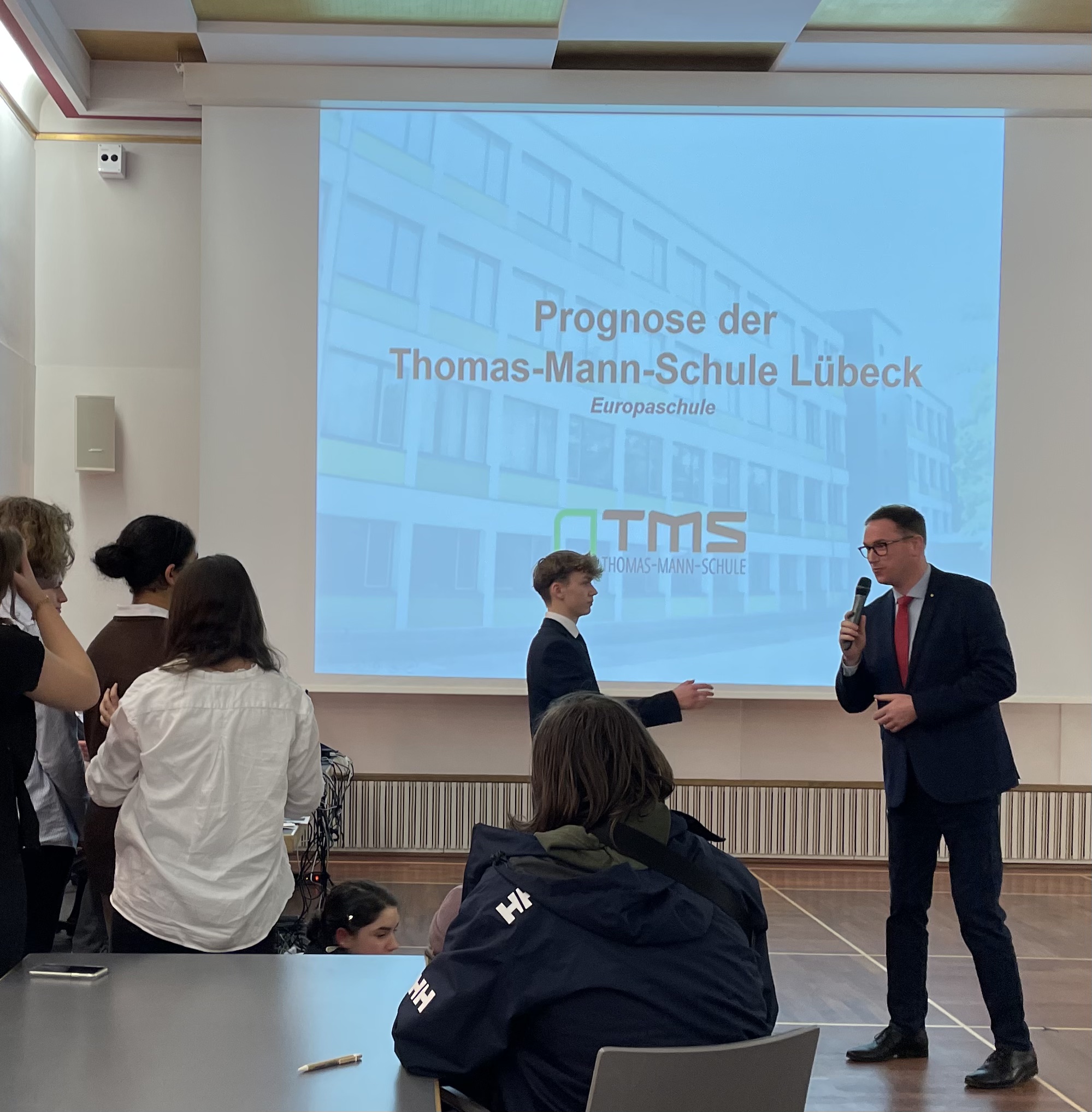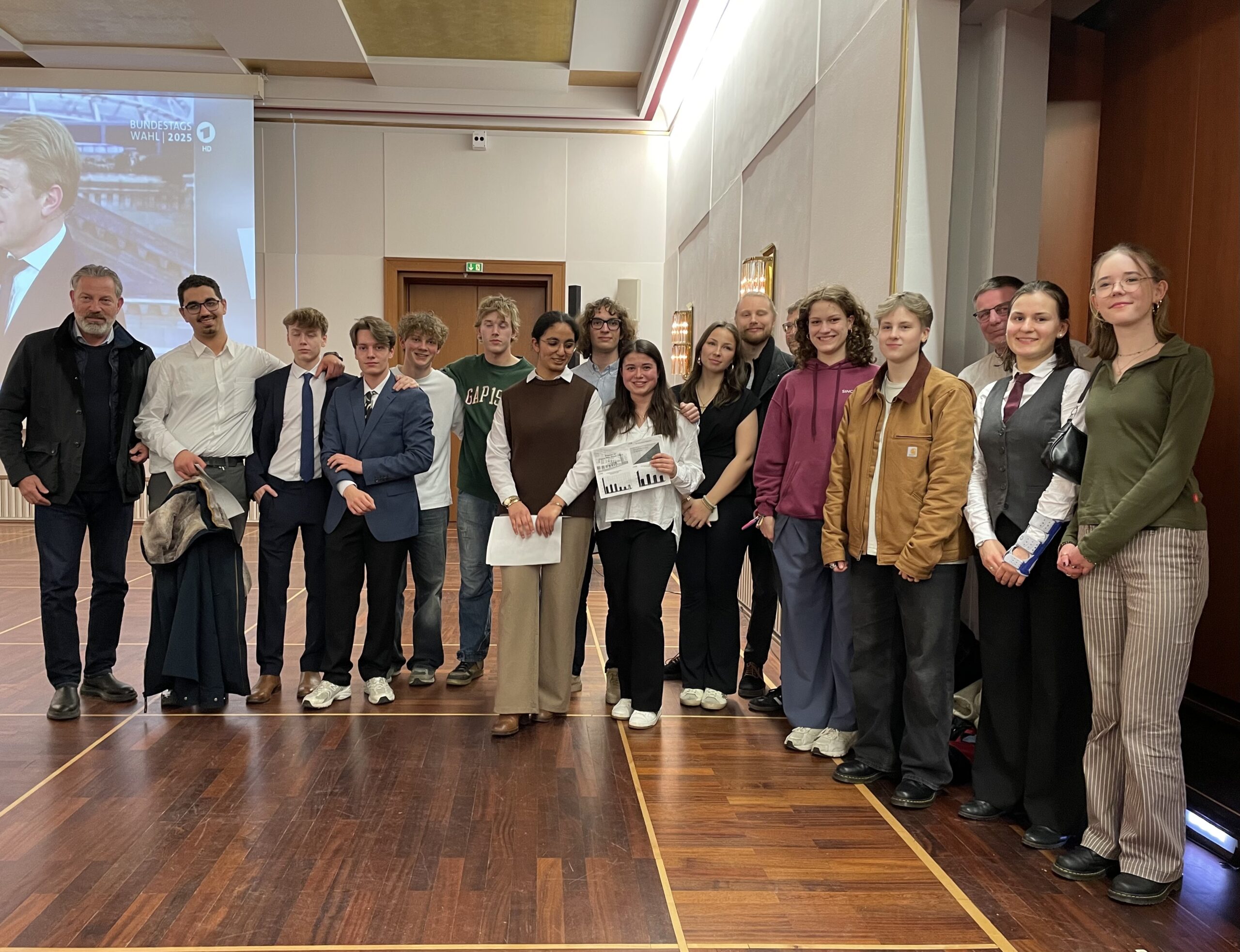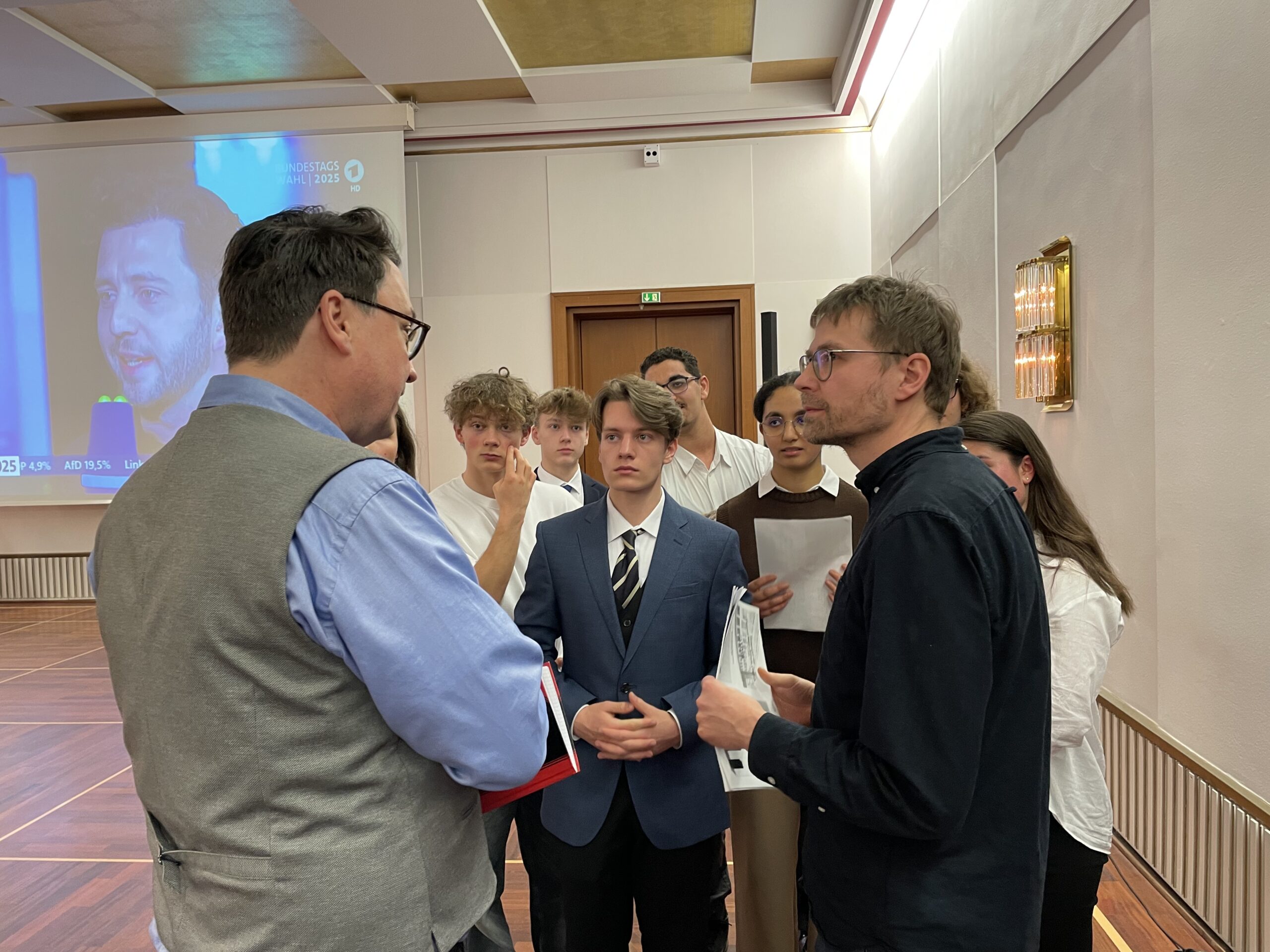 LN-Redakteur Helge von Schwarz interviewt unsere Schülerinnen und Schüler nach ihrer Präsentation zu ihren Erfahrungen im Projekt. Übereinstimmend berichten sie, dass sie auf eine große Bereitschaft der Wählerinnen und Wähler gestoßen seien, an der Nachwahlbefragung teilzunehmen. Zufrieden zeigt sich auch Wipo-Lehrer Daniel Klingebiel, der das Projekt organisiert und die Schüler betreut hat. Durch die große Beteiligung habe die Hochrechnung früher als sonst erstellt werden können.