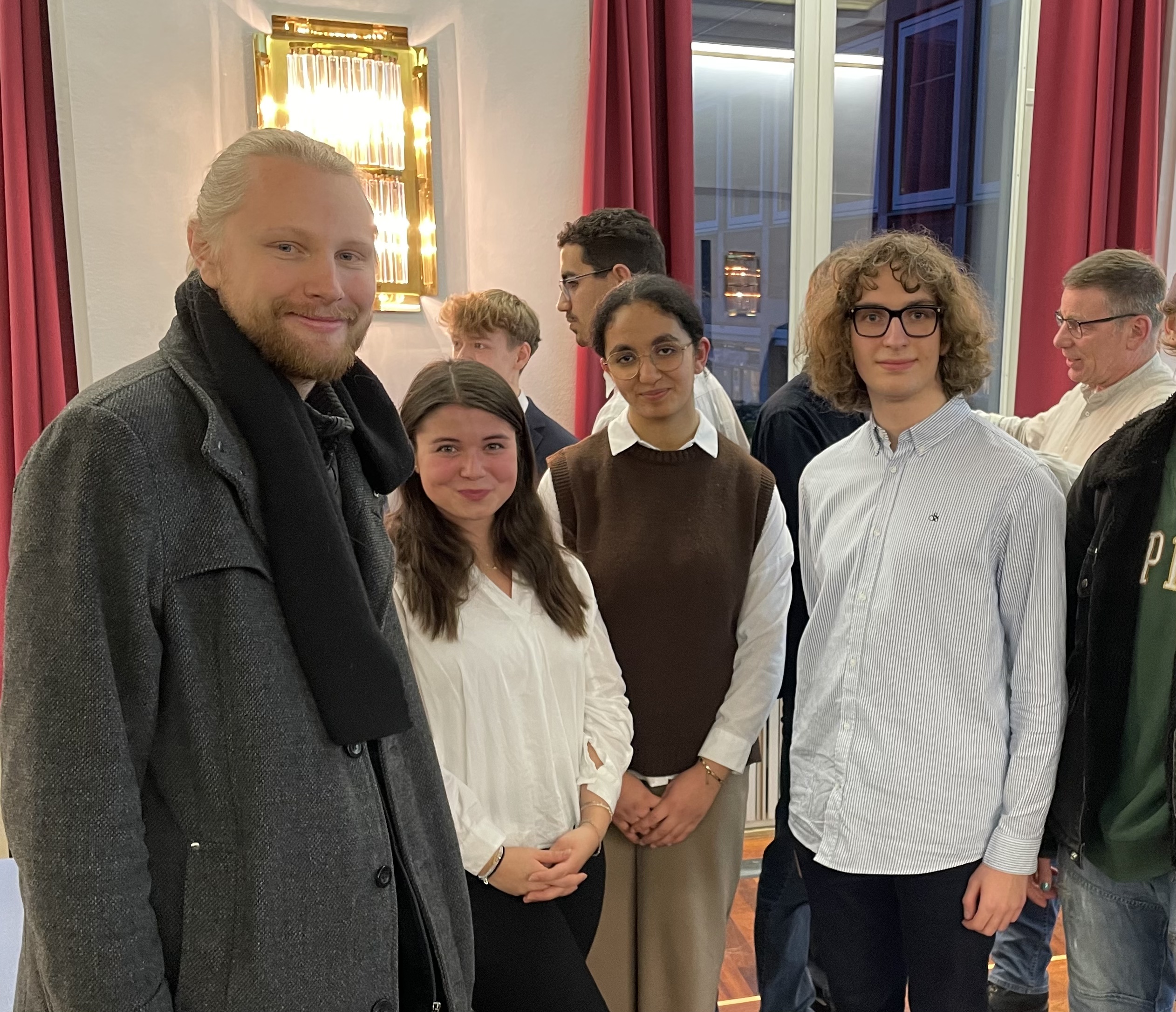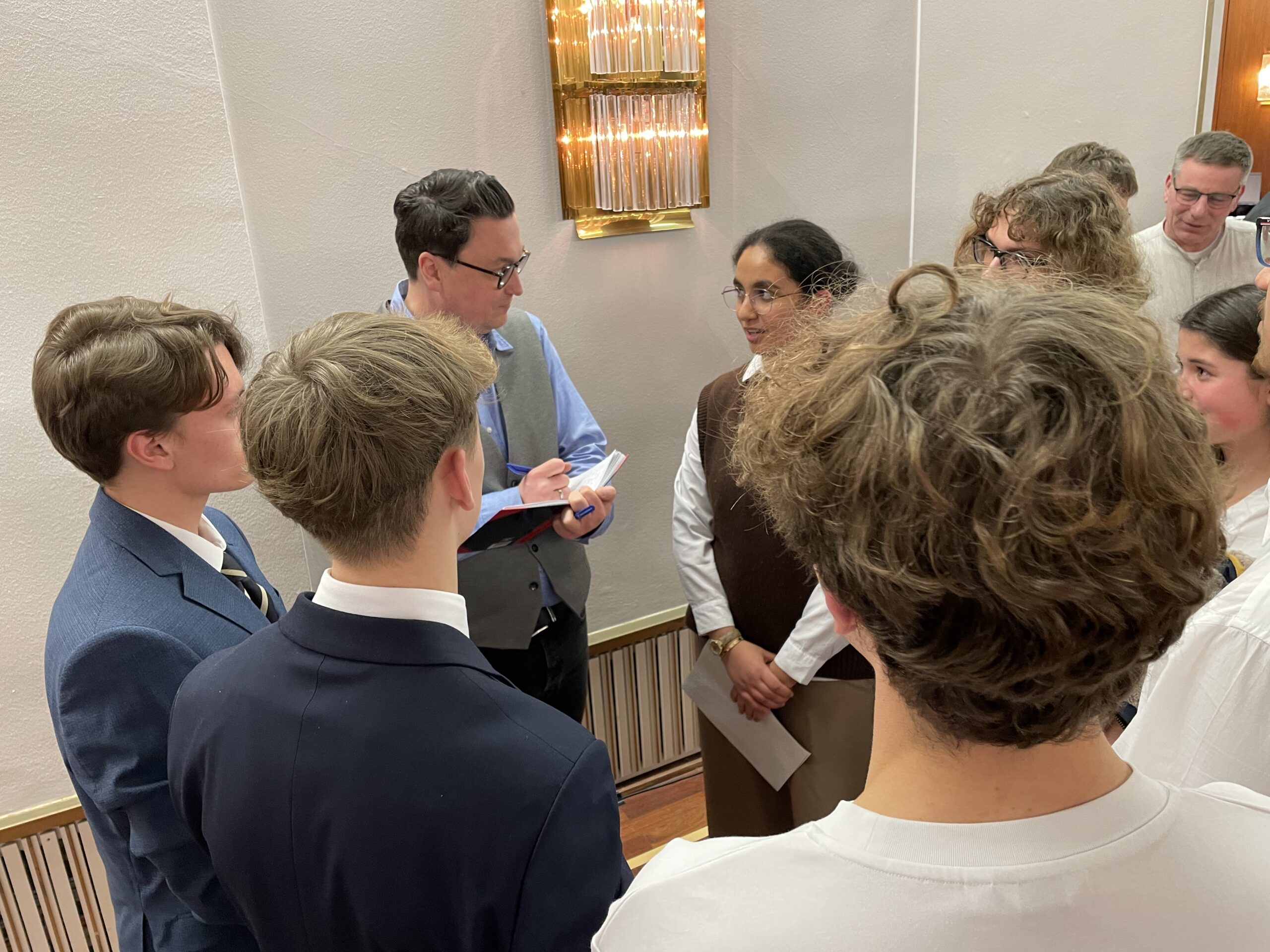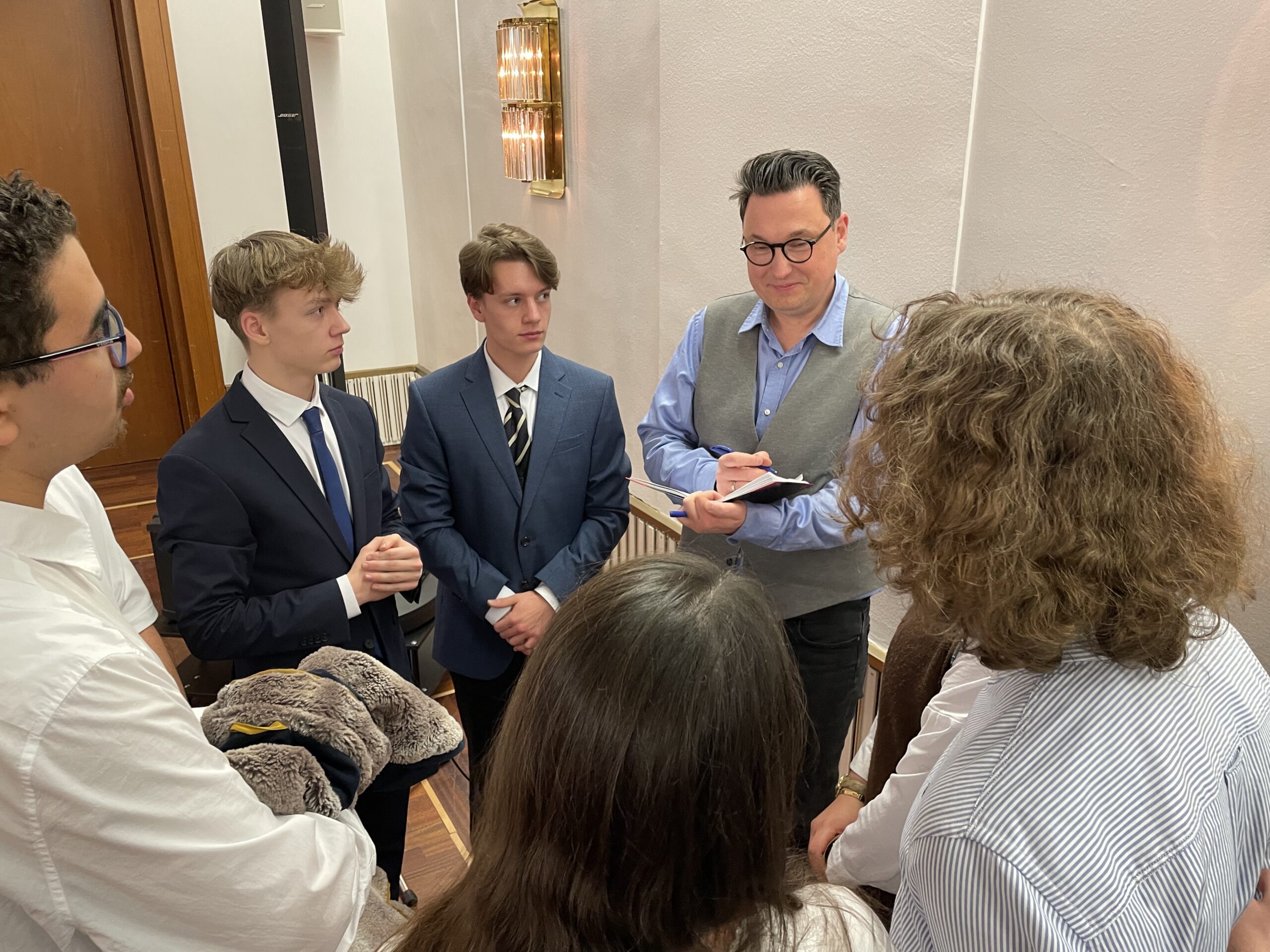 LN-Redakteur Helge von Schwarz interviewt unsere Schülerinnen und Schüler nach ihrer Präsentation zu ihren Erfahrungen im Projekt. Übereinstimmend berichten sie, dass sie auf eine große Bereitschaft der Wählerinnen und Wähler gestoßen seien, an der Nachwahlbefragung teilzunehmen. Zufrieden zeigt sich auch Wipo-Lehrer Daniel Klingebiel, der das Projekt organisiert und die Schüler betreut hat. Durch die große Beteiligung habe die Hochrechnung früher als sonst erstellt werden können.