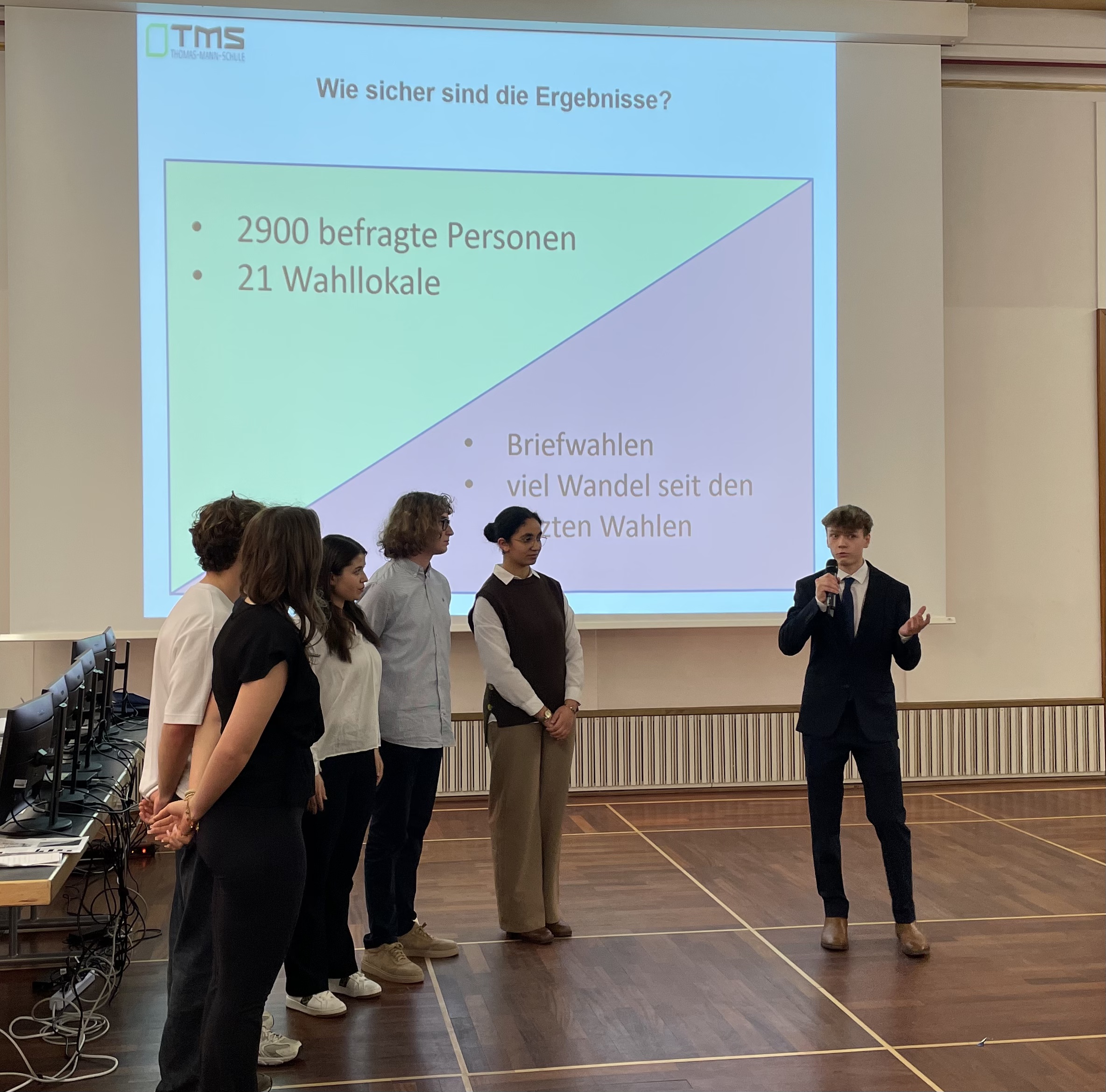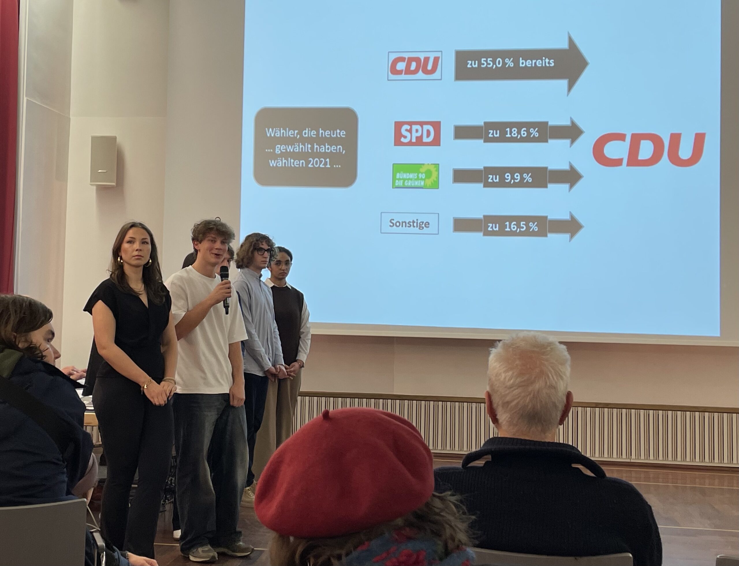 Auch die Wählerwanderungen haben die TMS-Schüler untersucht. Mick erläutert die Ergebnisse für die CDU.