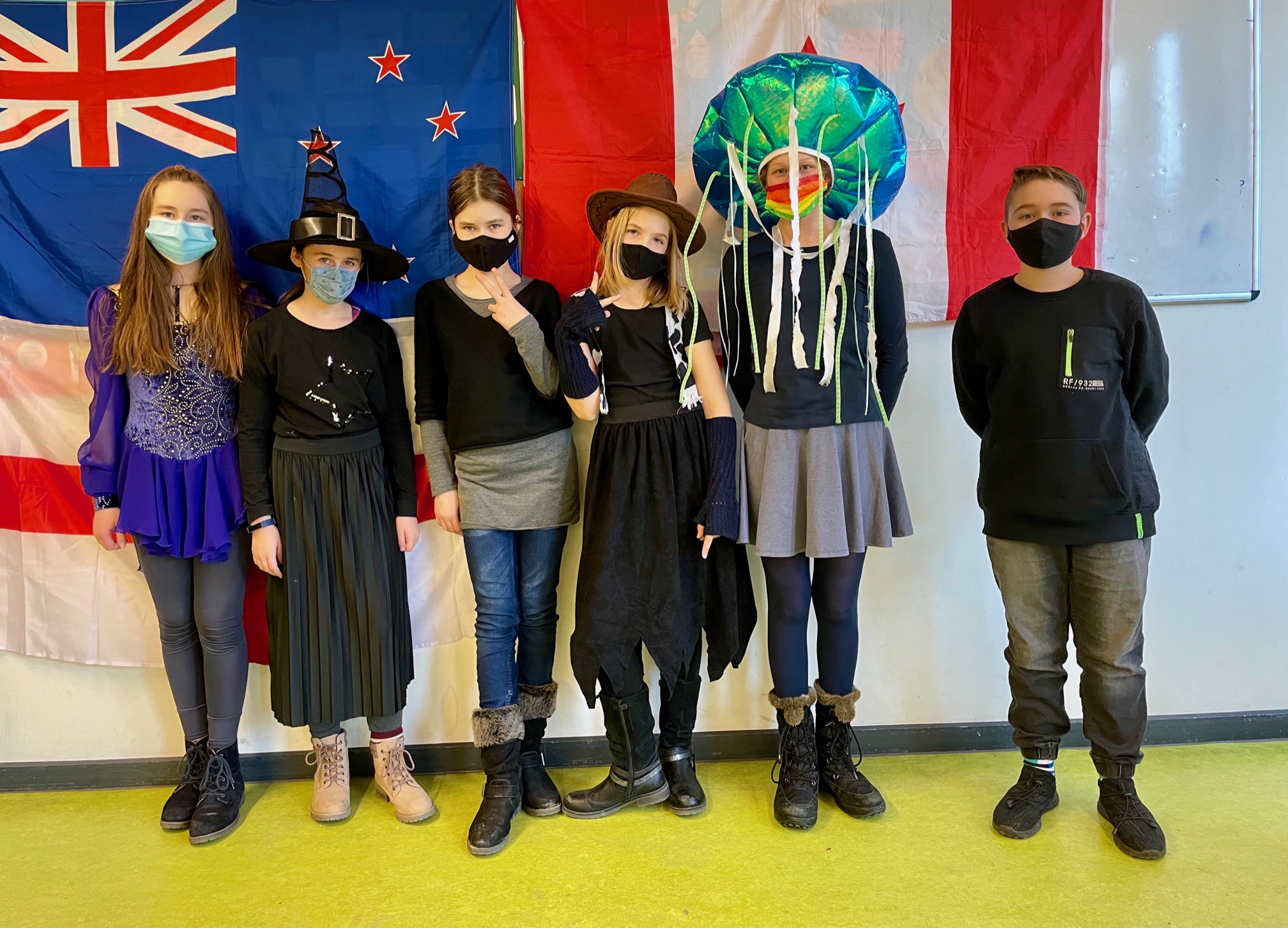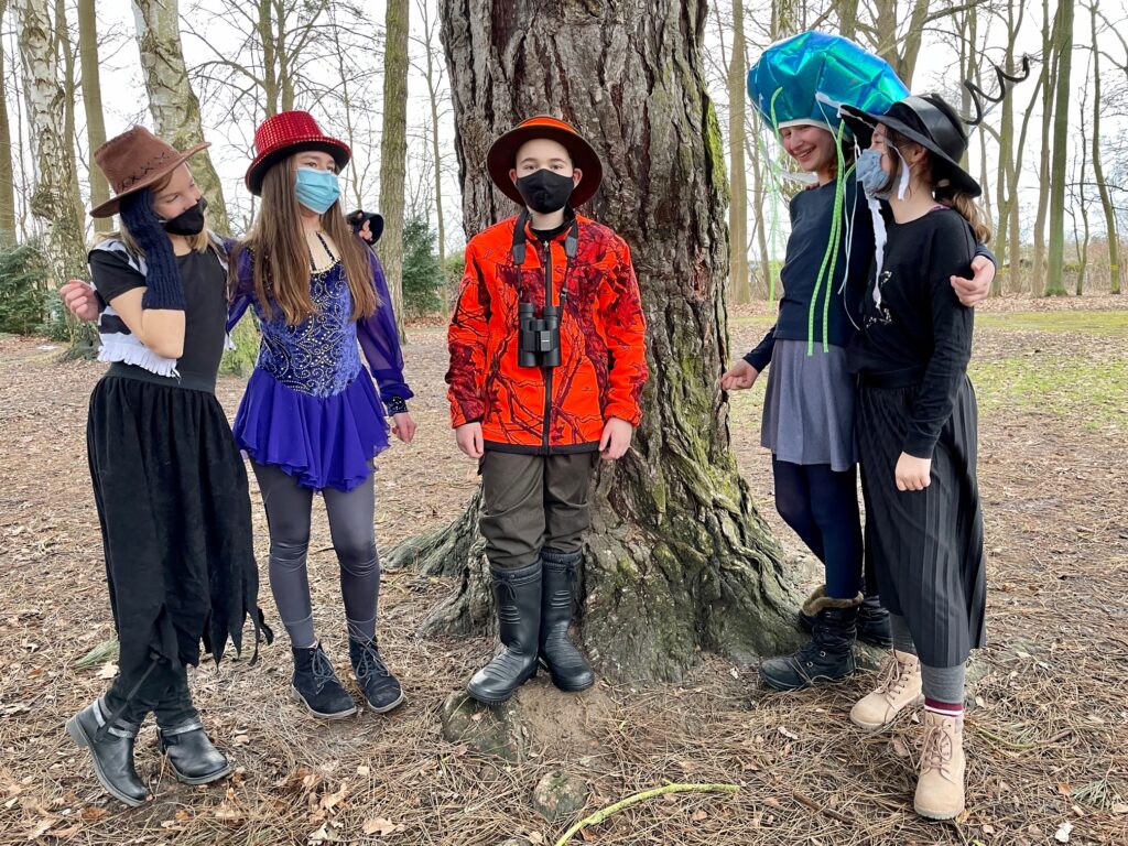 Für den Wettbewerb im Team hatten sich sieben Mädchen und zwei Jungen aus der 6a angemeldet. Die Bedingungen für eine Zusammenarbeit im Team waren in diesem Schuljahr besonders schwierig. Treffen in einer so großen Gruppe waren nur begrenzt überhaupt möglich. Nach den Weihnachtsferien, die Phase, in der eigentlich regelmäßig geprobt wird, entfiel der Präsenzunterricht komplett, die Schulen waren geschlossen. Dieses Team hat trotz all dieser Schwierigkeiten motiviert an seinem Projekt gearbeitet.  Das Thema Corona, das Tragen von Masken wurden in das Stück eingebaut. In nachmittäglichen Videokonferenzen wurde der Text miteinander geübt, Fragen wurden geklärt, über Kostüme und Requisiten gesprochen.