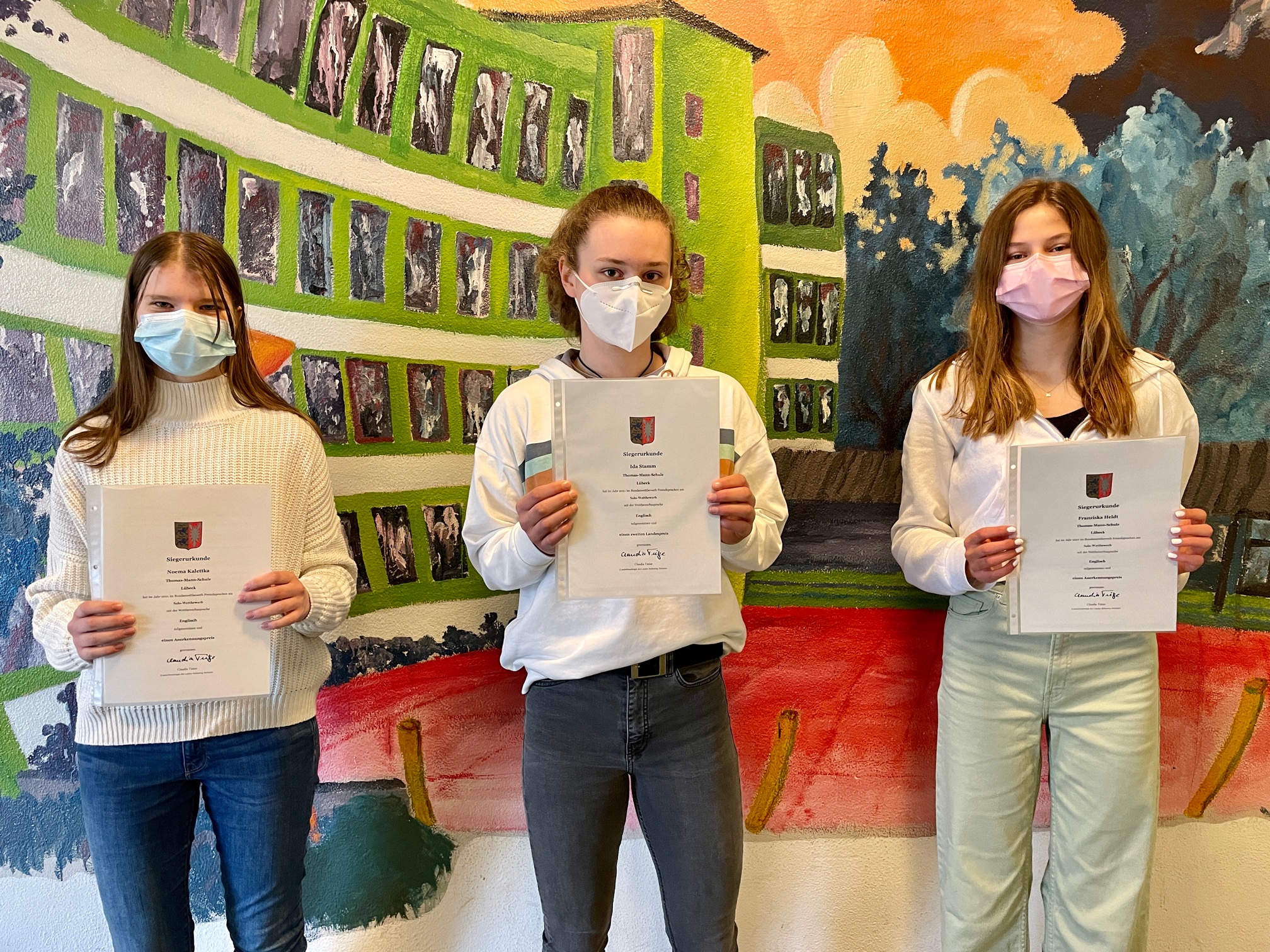 Drei Schülerinnen aus der 9a, Ida, Franziska und Noema, haben sich dann am 12.01.2021 allen Aufgaben (Hörverstehen, Leseverstehen, kreative Textproduktion und Wissen über das Thema Commonwealth) gestellt und haben nun die Ergebnisse erhalten. Wir gratulieren Franziska und Noema zu einem Anerkennungspreis, sowie Ida zu einem großartigen 2. Landespreis.